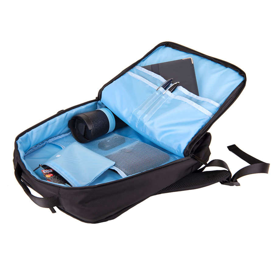 Основная ткань: цвет, близкий к Pantone Black C, подкладка: цвет, близкий к Pantone 2169 C • Основная ткань: 100% полиэстер, подкладка: 100% полиэстер• Объём: 20 литров• Вмещает ноутбук 15,6" Описание:• Сочетание основного прочного водоотталкивающего материала и яркой контрастной подкладки • Два основных отдела с обратной молнией, защищающей от попадания влаги внутрь• Два дополнительных внешних кармана на молнии• Внутри укрепленный отдел для ноутбука с защитной тесьмой на липучке• Специальный RFID карман с системой защиты от несанкционированного считывания персональных данных• Внутренние карманы-сетки и карман-органайзер для дополнительного хранения• Удобная петля из эластичной резинки для термокружки• Специальная стропа на спинке для крепления на выдвижной ручке чемодана• Эргономичная спинка и лямки рюкзака из вентилируемого материала• Укрепленная ручка рюкзака• Карманы для проездных карт на лямках рюкзака• Светоотражатели на лямках рюкзака для обеспечения безопасности• Лямки прошиты дополнительными стропами в быстро изнашиваемых местах, которые можно отрегулировать по длине и зафиксировать пластиковыми крепежами• Брендированные металлические пуллеры Bag Fly• Жаккардовый логотип Bag Fly внутри• Картонный ярлык Bag Fly• Внутрь рюкзака вложена сумка из нетканого материала для хранения • Упаковка: прозрачный пакет -