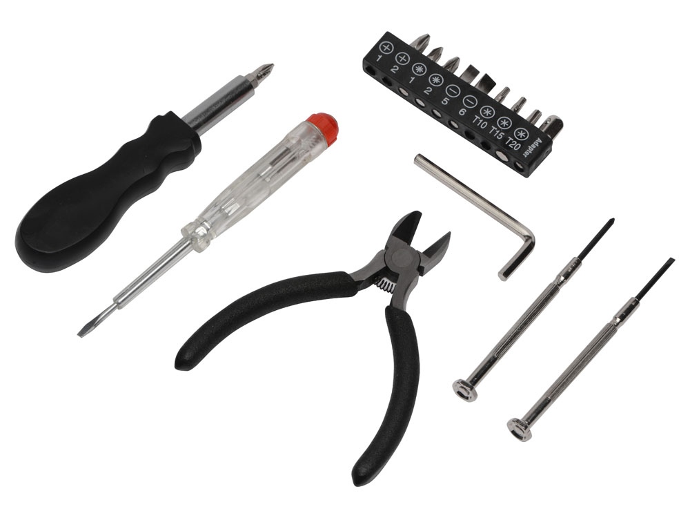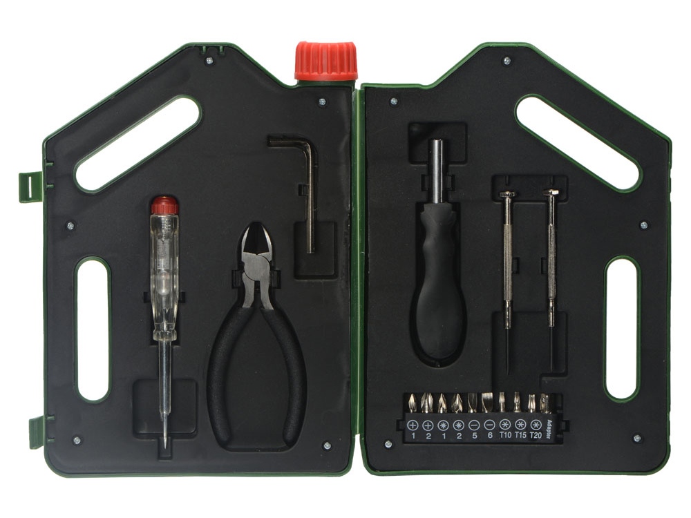 Набор инструментов в футляре в виде канистры включает в себя 1 тестер напряжения, 1 пару плоскогубцев, 1 шестигранный ключ, 1 рукоятку, к которой можно крепить отвертки, 2 прецизионные отвертки, 1 крестообразную головку, 1 плоскую головку, 10 бит. -