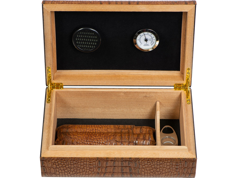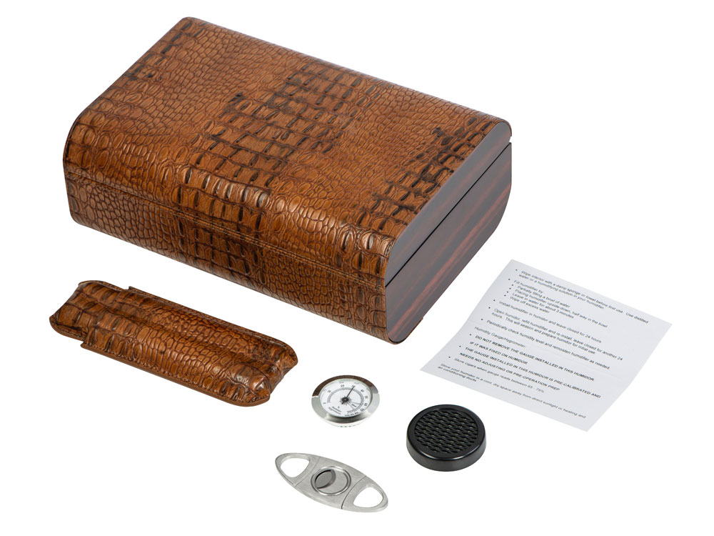 Прекрасный подарок для ценителей сигар. Хьюмидор в комплекте с аксессуарами для хранения и курения сигар придется по вкусу успешным бизнесменам. В комплект входят хьюмидор, футляр и нож для сигар, гигрометр и увлажнитель. -