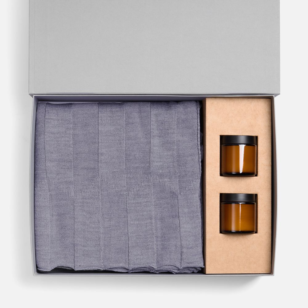 плед - акрил 100%, плотность 286 г/кв.м; подсвечник - стекло, крышка - пластик; свеча - парафин, соевый воск, парфюмерная композиция; коробка - переплетный картон, бумага Malmero