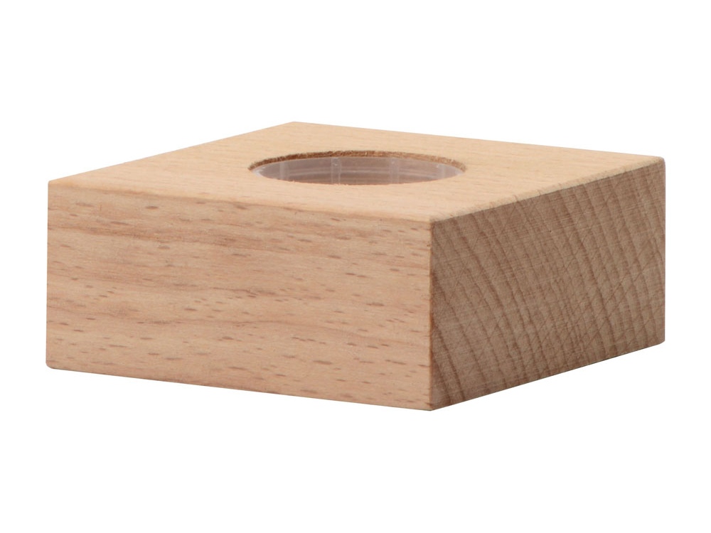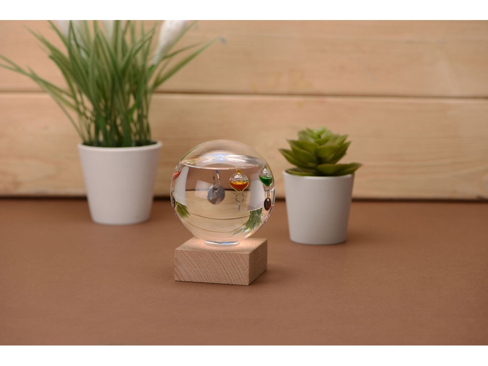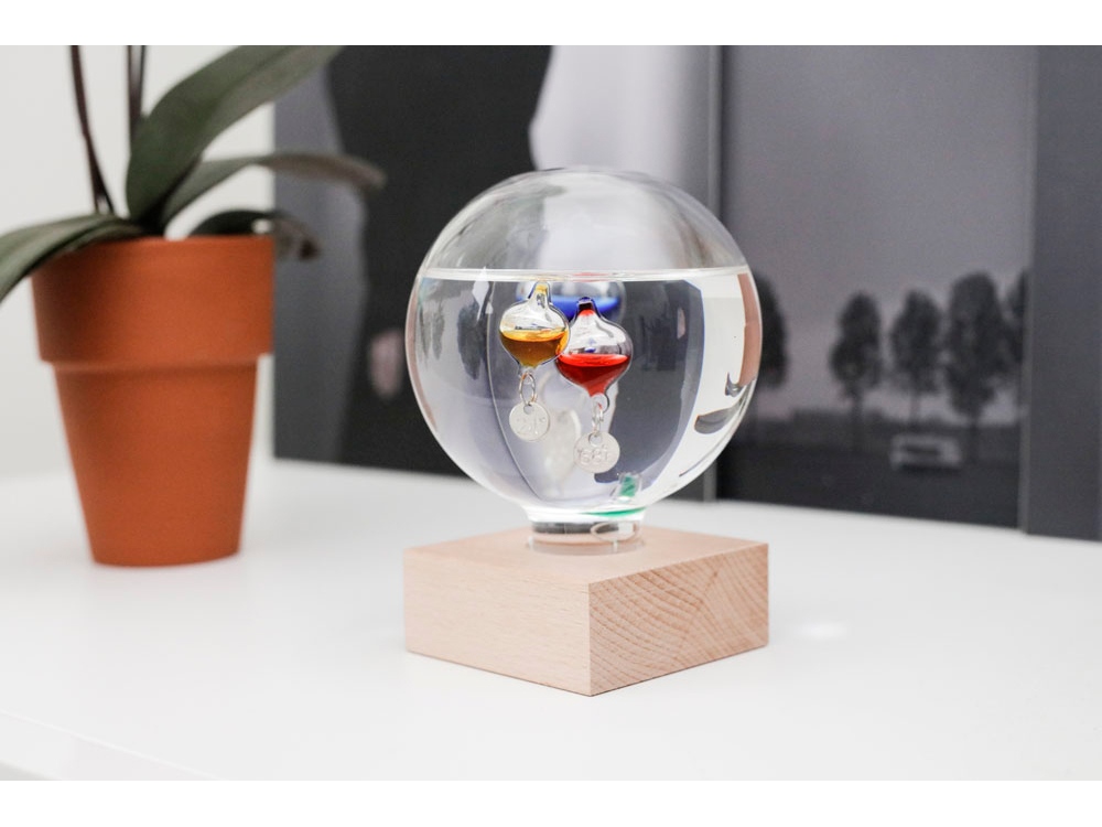 В основе действия этого круглого стеклянного термометра – принцип действия реально существовавшего и популярного в свое время термометра Галилея, который представлял, правда, не шарик, а высокую колбу с такими же стеклянными буйками, в каждом из которых – жидкость разной плотности. На каждом из буйков висит табличка с температурой, указанной в градусах Цельсия и Фаренгейта. Не укатиться шарику помогает деревянная подставка.