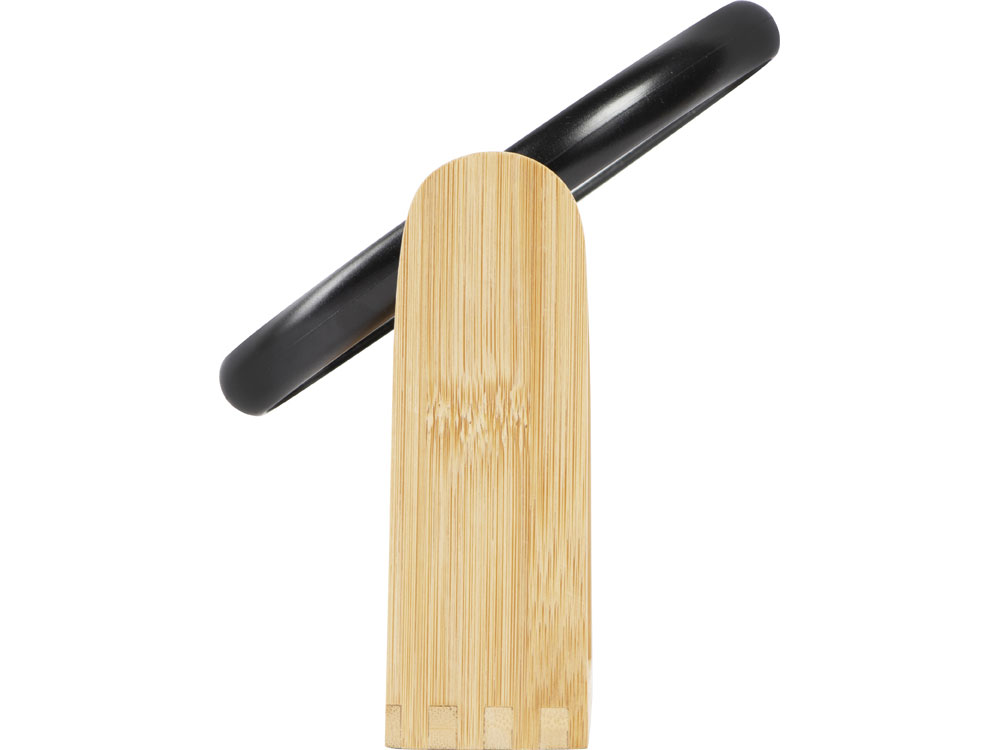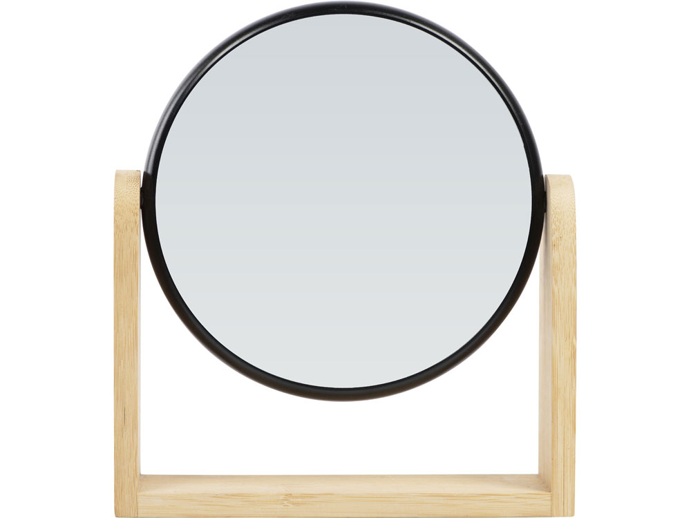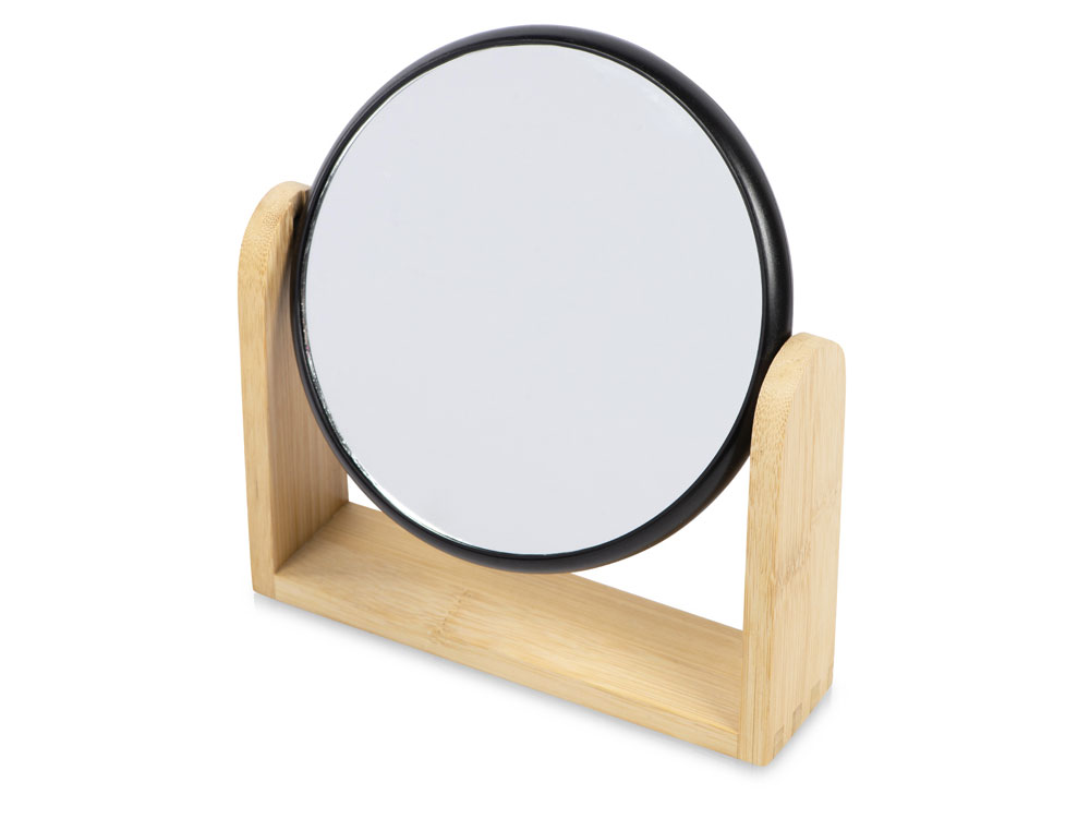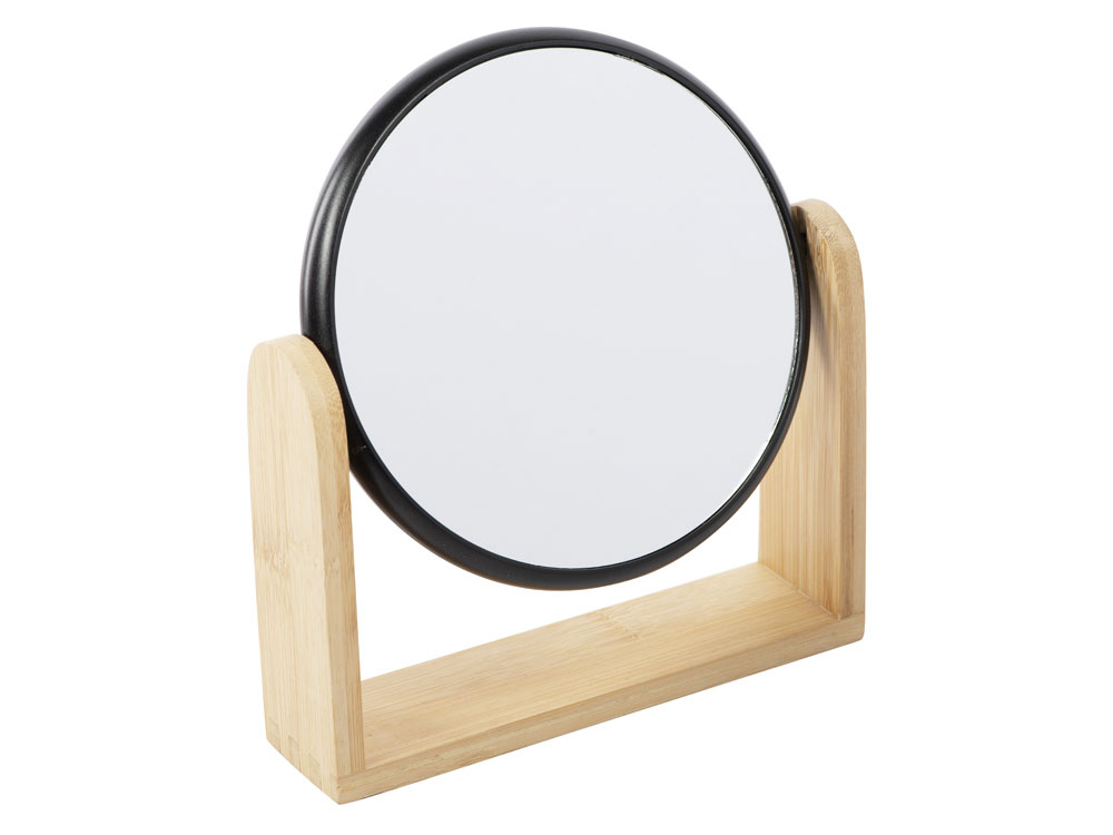Стильное двустороннее зеркало с бамбуковой подставкой в черной рамке. Одна сторона показывает стандартное отражение, другая - с 2-хкратным увеличением. -