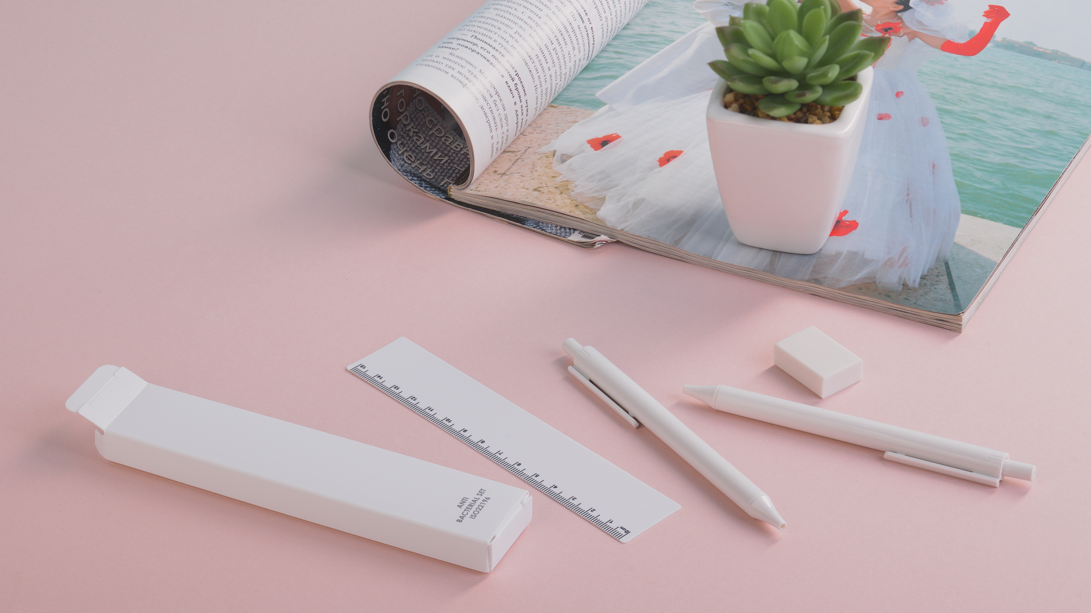 Антибактериальный набор включает ручку, механический карандаш (грифель 0,5 мм в комплекте), линейку на 15 см и ластик. Благодаря добавлению высокоэффективных противомикробных агентов достигается резкое снижение уровня бактерий, присутствующих на поверхностях материалов. Изделие соответствует стандарту ISO 22196, который определяет антибактериальную активность пластмасс и непористых поверхностей.