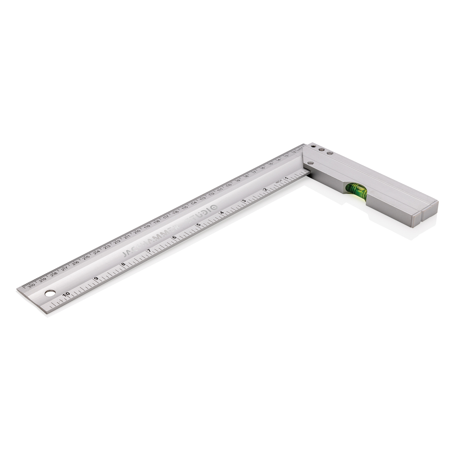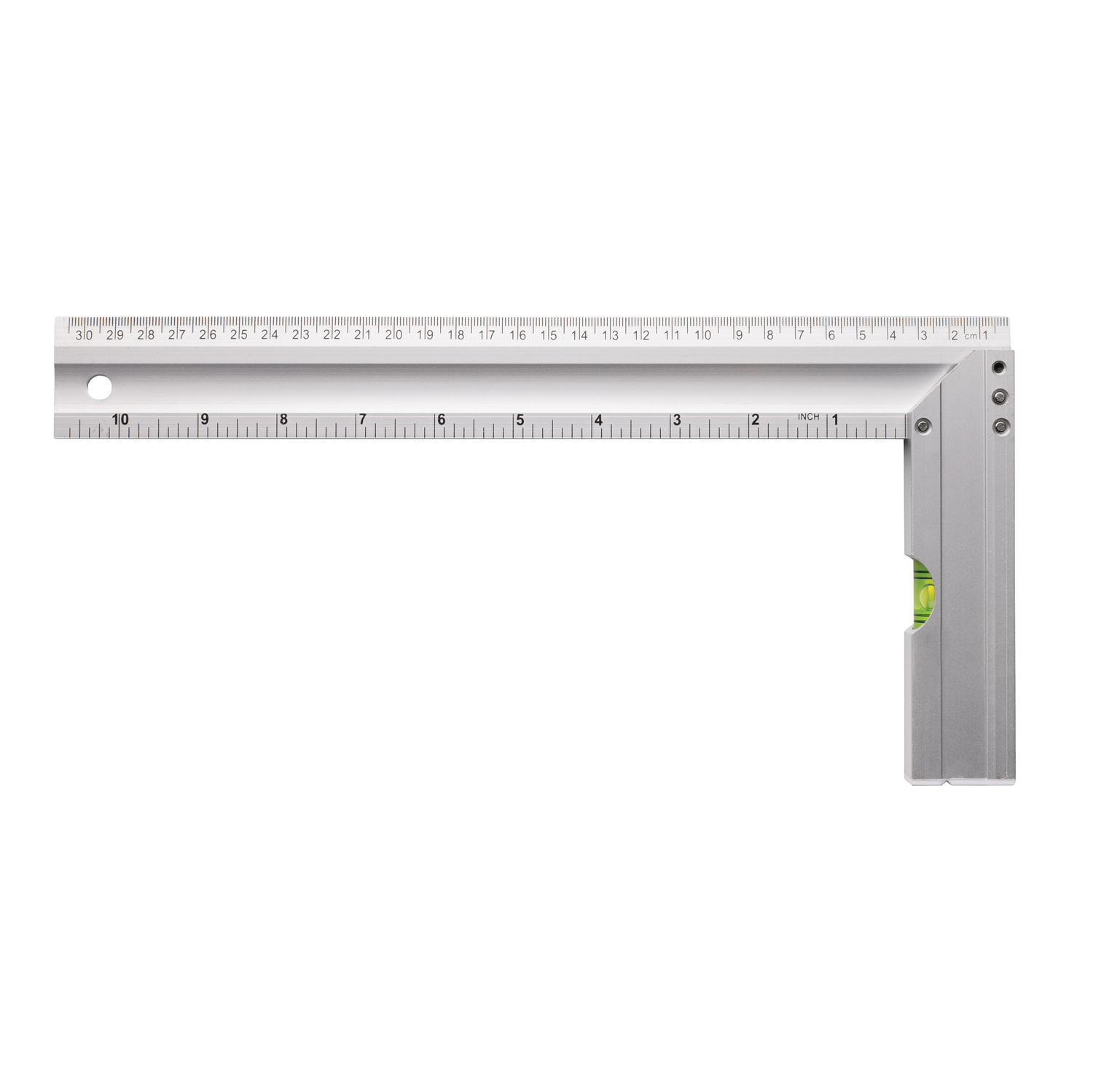 Настоящим профессионалам своего дела обязательно пригодится прямоугольная линейка с уровнем. Она подходит для черчения квадратов и измерения углов, имеет двухстороннюю печать: на одной стороне указаны сантиметры, на другой — дюймы. Длина линейки 30 см (10 дюймов). Точность уровня — 0,5 см. Изготовлена из алюминия.