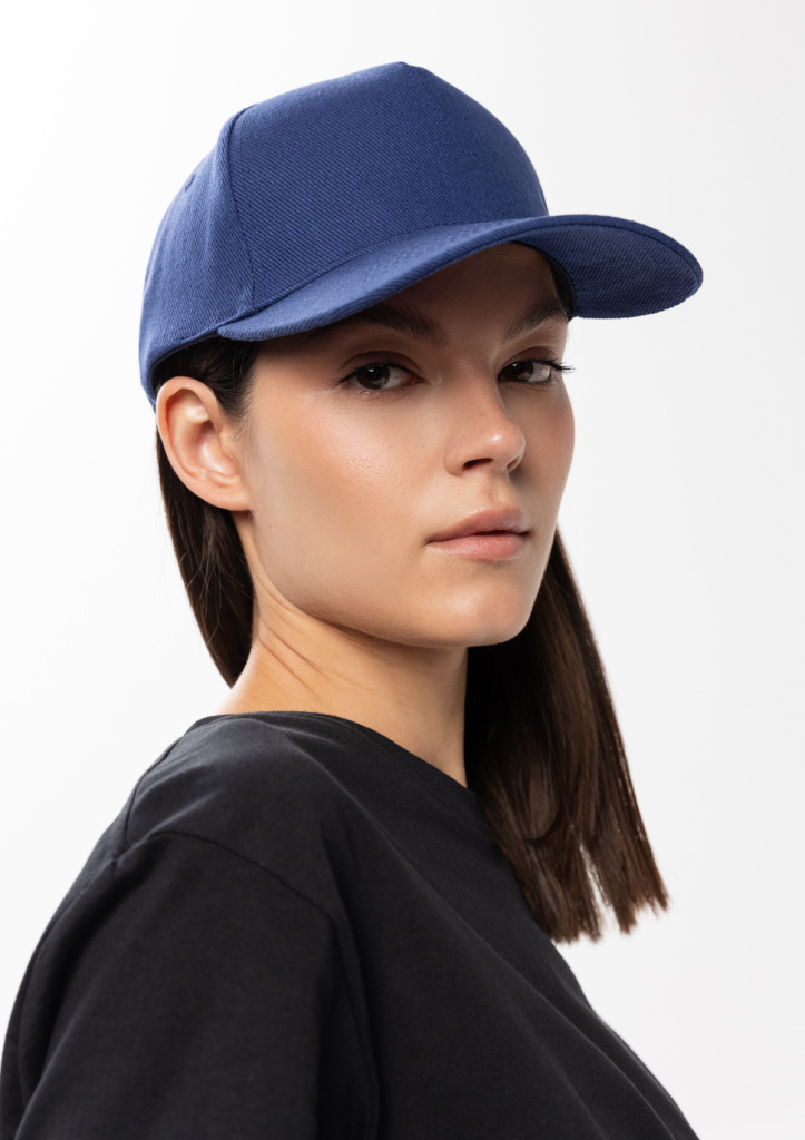 Бейсболка-пятиклинка без лобового шва с изогнутым жестким козырьком. Посадка регулируется ремешком на металлической застежке.