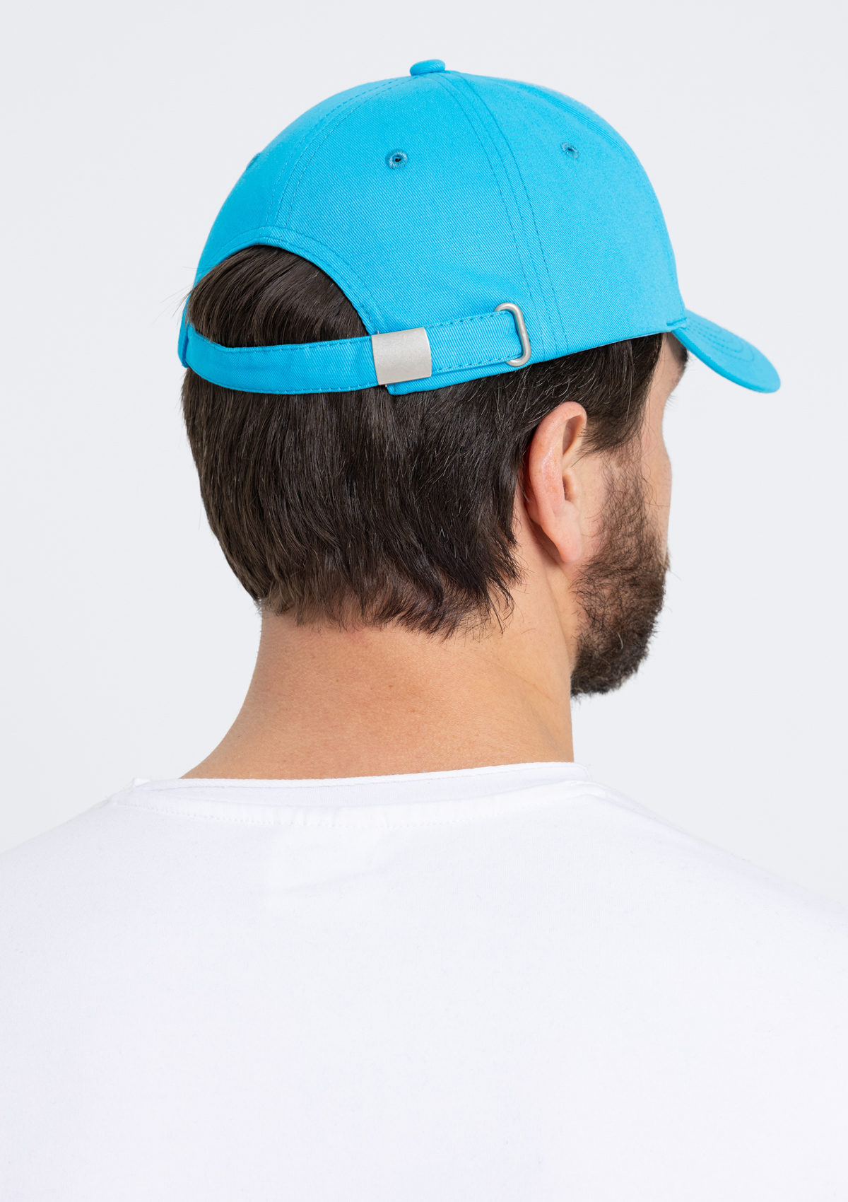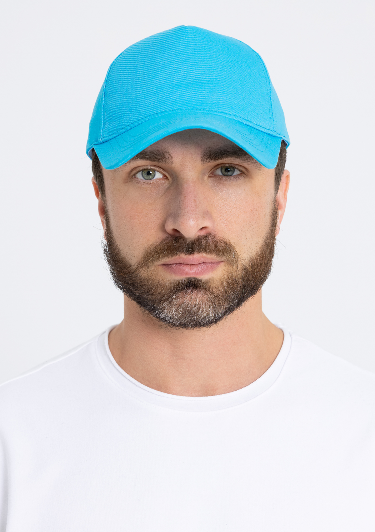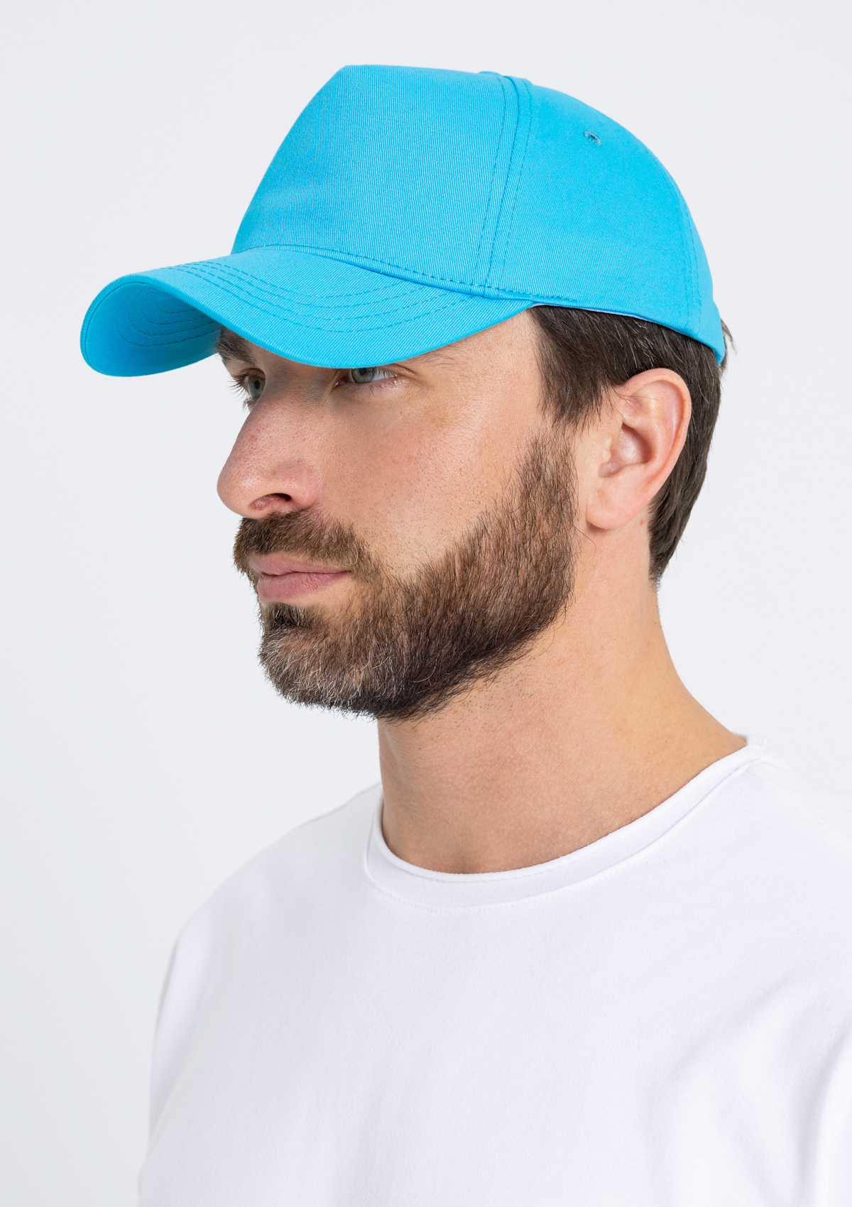 Бейсболка-пятиклинка без лобового шва с изогнутым жестким козырьком. Посадка регулируется ремешком на металлической застежке.