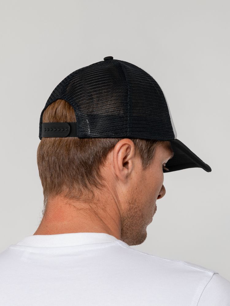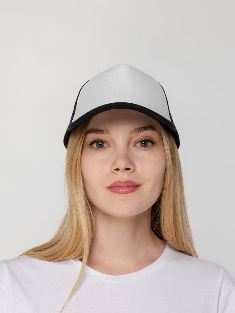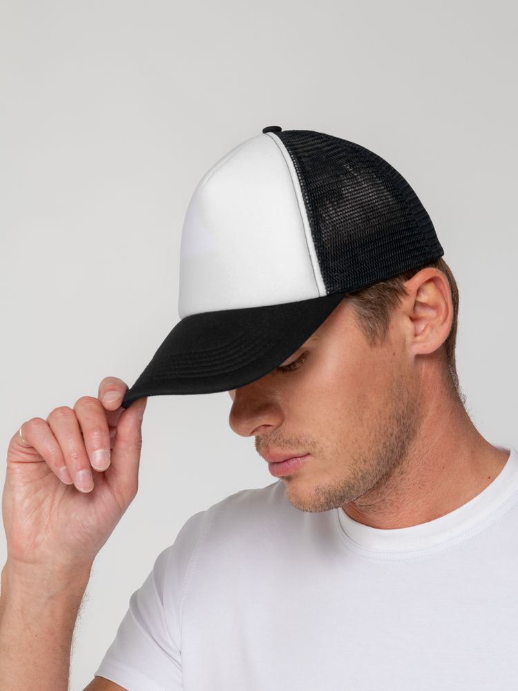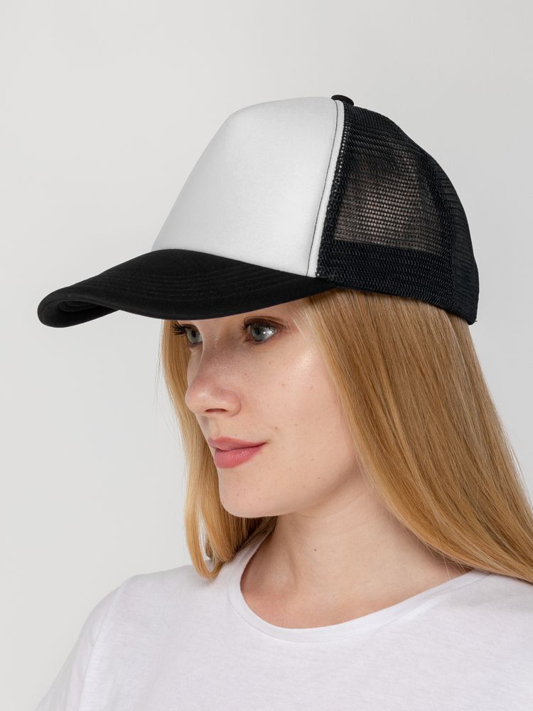 Стандартная модель с 5 клиньями без лобового шва в нестандартном исполнении. Передний клин и козырек выполнены из полиэстера с наполнителем из поролона, боковые и задние клинья — из сетки. Размер регулируется с помощью пластиковой застежки. -
