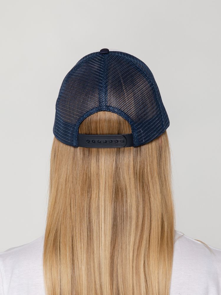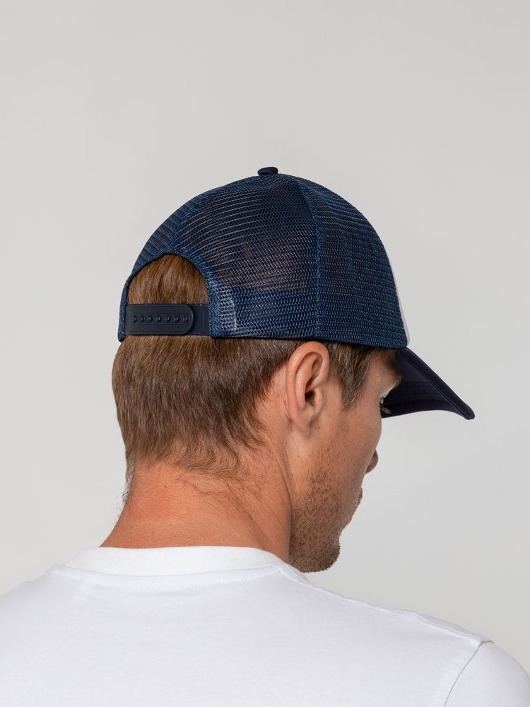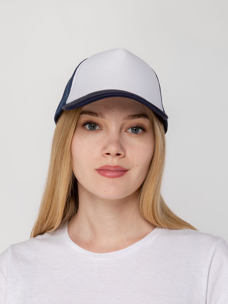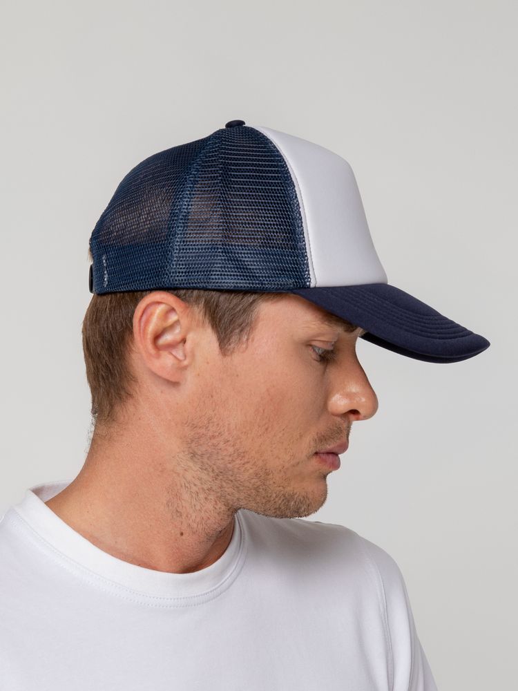 Стандартная модель с 5 клиньями без лобового шва в нестандартном исполнении. Передний клин и козырек выполнены из полиэстера с наполнителем из поролона, боковые и задние клинья — из сетки. Размер регулируется с помощью пластиковой застежки. -