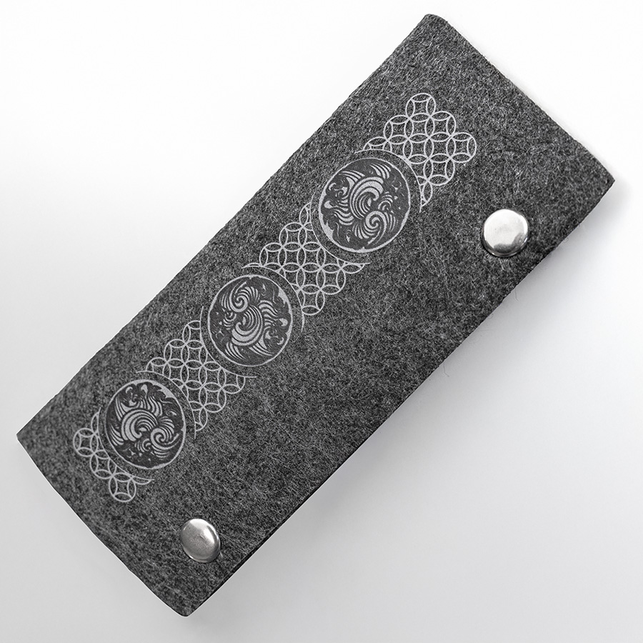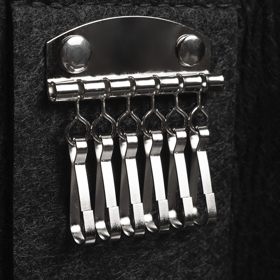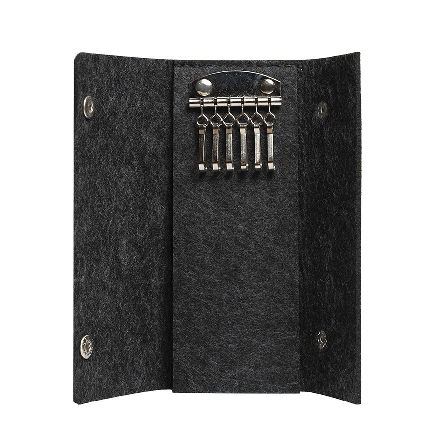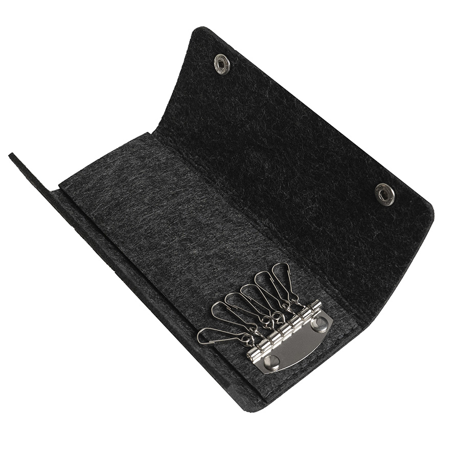 Ключница из RPET фетра на 2х кнопках-застежках. Внутри металлическая вставка на 6 ключей. Цвет темно-серый. Размер 10 х 17,3 см (20,3 х 17,3 в раскрытом виде). Плотность 3 мм. Виды нанесения: обычный трансфет и DTF. -
