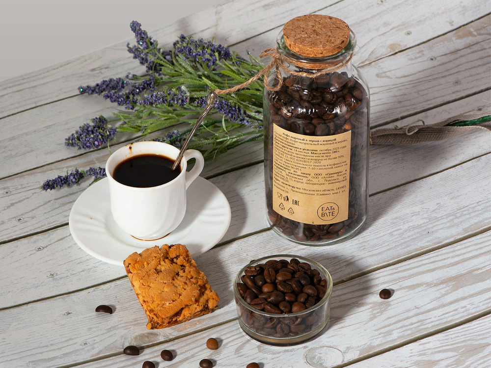 Состав: кофе натуральный жареный в зернах, палочки корицы. -