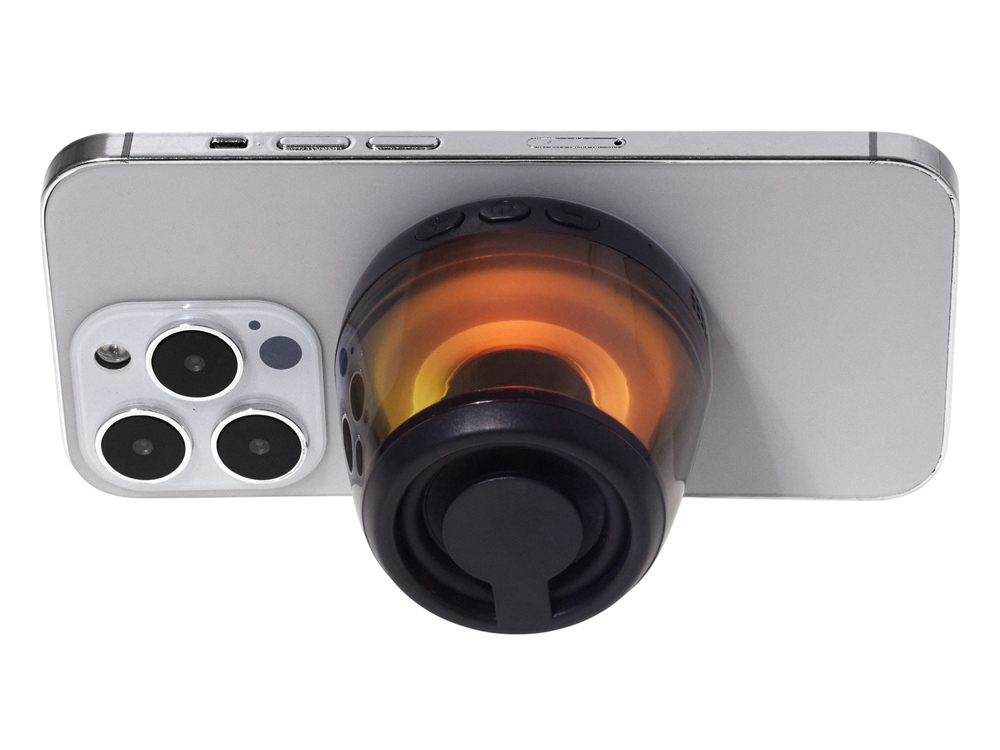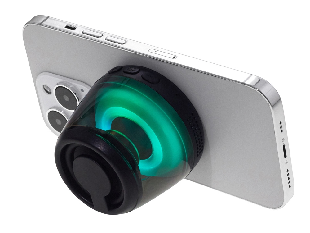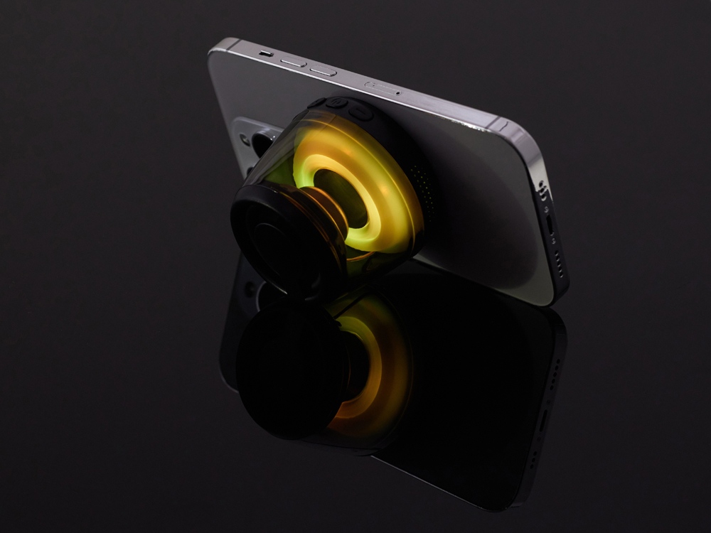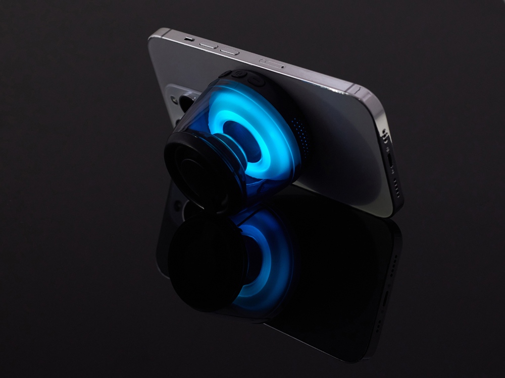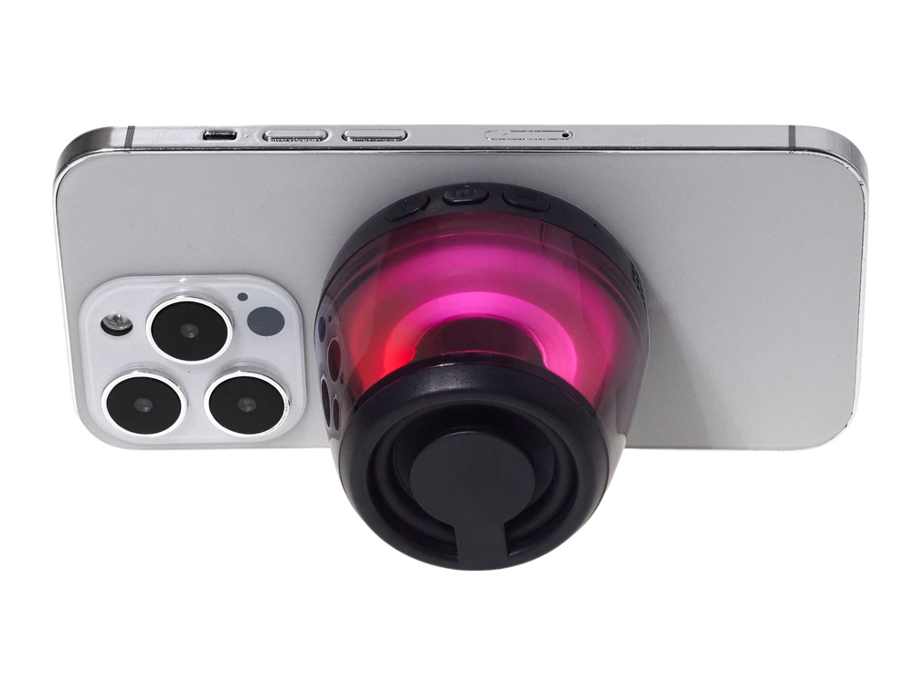 Современная магнитная Bluetooth-колонка колонка крепится к любому смартфону (iPhone -нативно, к другим -благодаря кольцу из комплекта). Это позволяет не только освободить руки, но и добавляет удобную подставку телефону. Динамик 40мм и мощностью 5 Вт обеспечивает сильное и насыщенное звучание даже в компактном корпусе. RGB подсветка имеет несколько режимов (переключение по трехразовому нажатию кнопки ВКЛ.). В комплекте кроме кольца – зарядный кабель USB-C и ремешок-ланъярд. Может принимать звонки и имеет разъем для micro SD карт памяти.