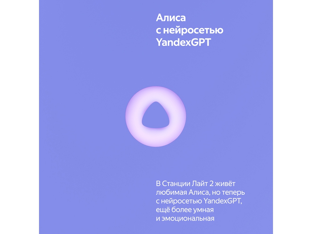 В Станции Лайт 2 живёт любимая Алиса, но теперь с нейросетью YandexGPT, ещё более умная, функциональная и эмоциональная. День за днём, детям и взрослым её компания никогда не наскучит.