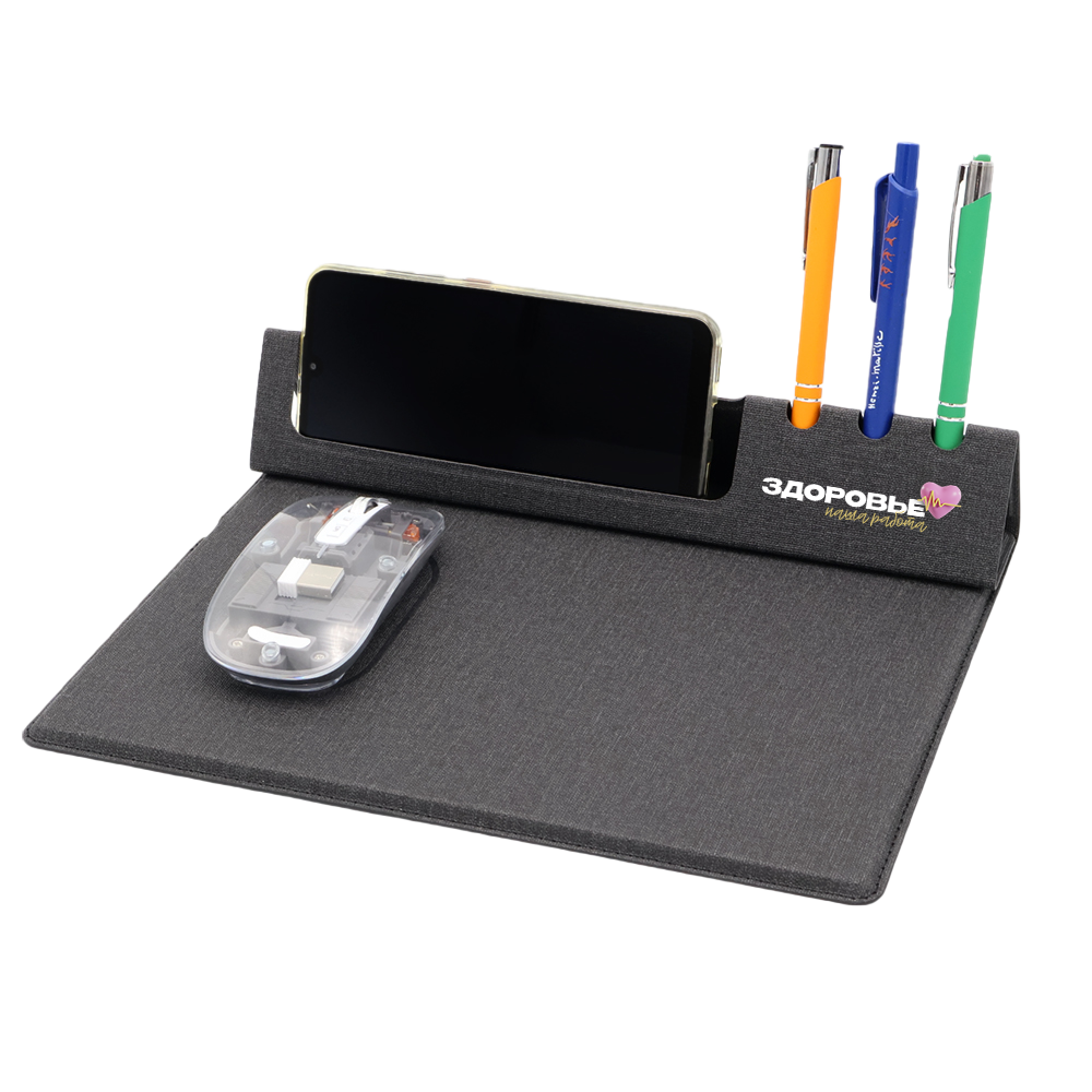 Коврик для мышки с зоной беспроводной зарядки (мощностью 15W) для телефона, дополнительно - складная зона в виде подставки для телефона. Размер коврика составляет 28*22*0,84см. Поддерживает все Android/Ios устройства с функцией беспроводной зарядки. Для работы беспроводной зарядки необходимо подключать устройство к сети через адаптер.- Виды нанесений: Термотрансфер DTF, Шелкотрансфер