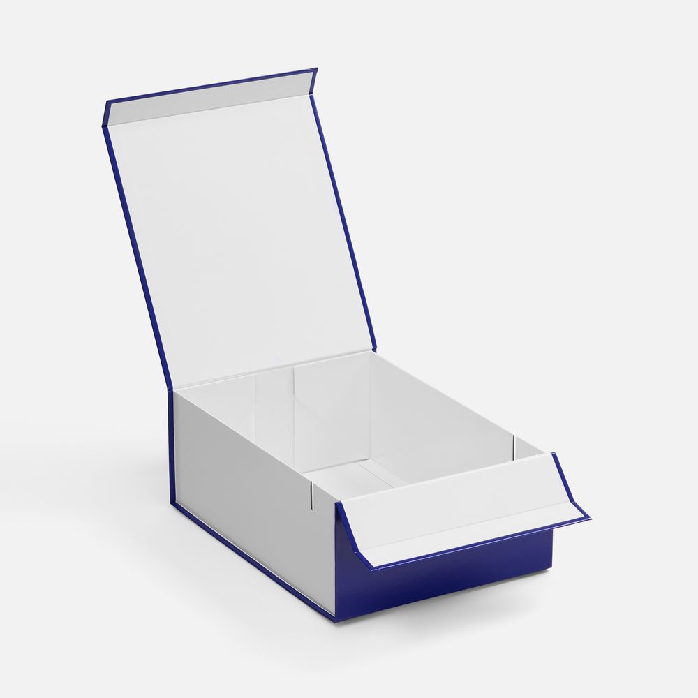 Плотная коробка из переплетного картона толщиной 2 мм с практичной конструкцией на двух створках. Складная система с уже нанесенным двусторонним скотчем позволяет быстро собрать коробку без дополнительных инструментов. Лайнер с полуглянцевым ламинированием устойчив к повреждениям и надолго сохраняет безупречный вид.