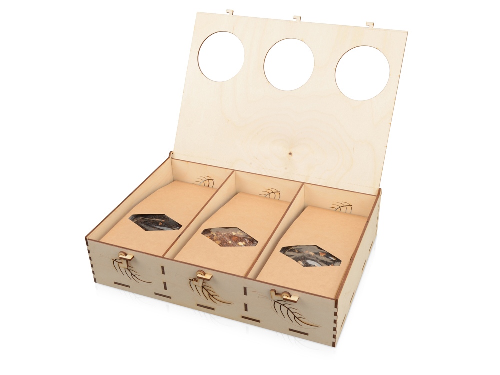 Подарочная коробка из трех секций, украшенная экопринтом в виде листа растения. В крышке над каждой из секций есть отверстие, чтобы можно было рассмотреть содержимое. Коробка выполнена из березовой фанеры и отлично гармонирует с наполнителем из крафтовой бумаги. Хотите нестандартно украсить подарок? Упакуйте его в подарочную коробку Лист, она сохранит его содержимое в целости и сохранности. -