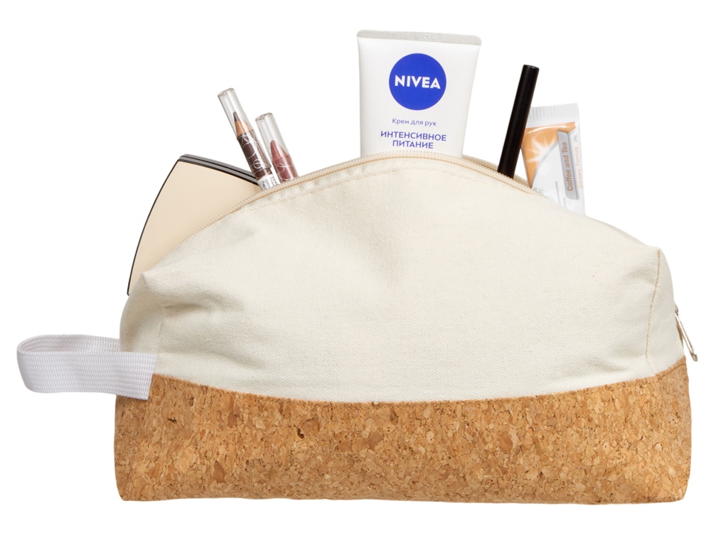 Большой вместительный несессер на молнии изготовлен из натуральных материалов - хлопка и пробки.