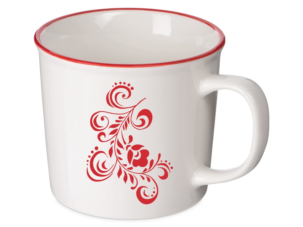Кружка из костяного фарфора с выраженным рельефным ободком, окаймленным цветной контрастной полосой. Цвет полосы можно органично сочетать с цветом нанесенного логотипа, что придаст дизайну конечного продукта цельность облика.