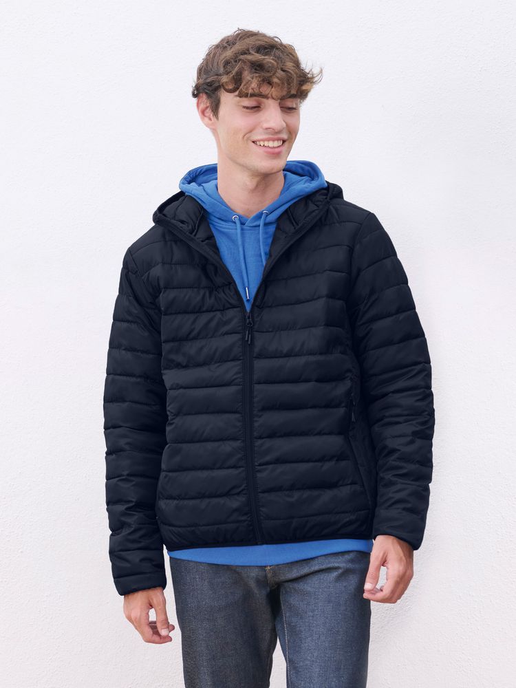 Мужская куртка с капюшоном комфортной посадки.- Два боковых кармана на молнии и два внутренних кармана без застежки