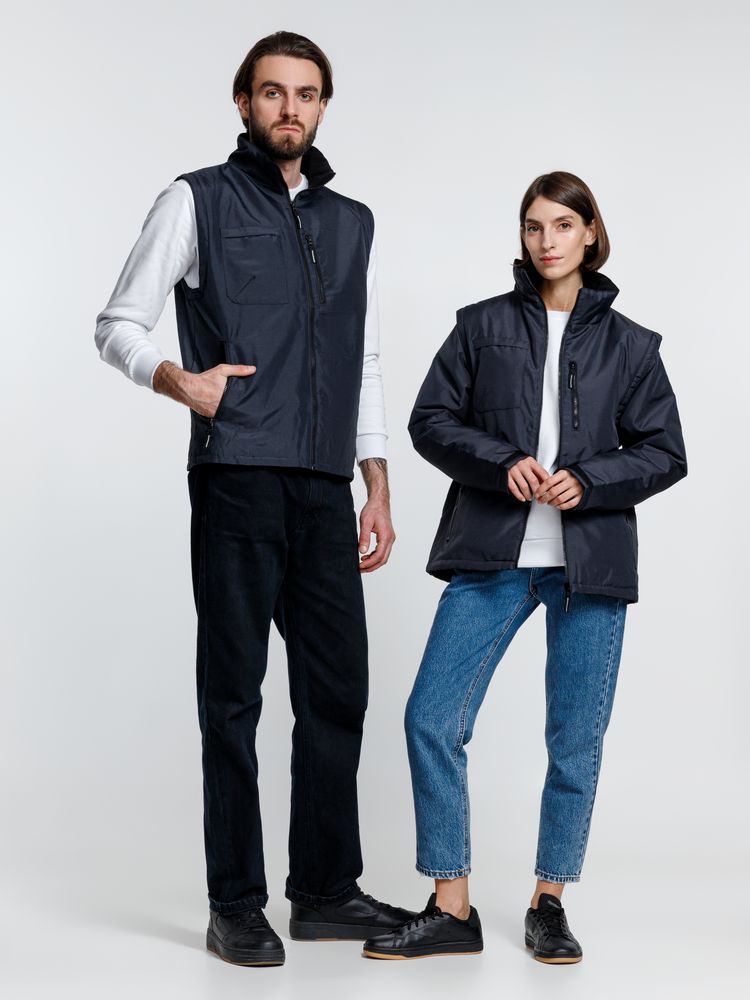 Куртка-трансформер, которая превращается в утепленный жилет. Выполнена из ткани оксфорд с водоотталкивающим покрытием. Модель унисекс.- Съемные рукава на молнии