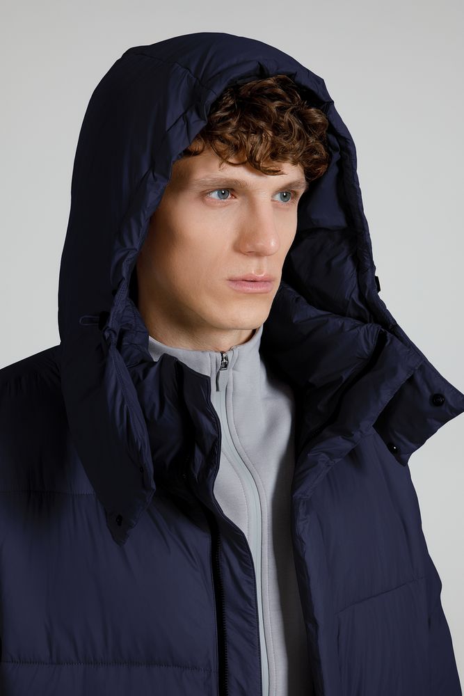 Удлиненный пуховик унисекс с капюшоном.