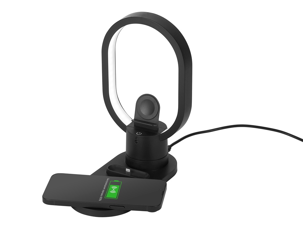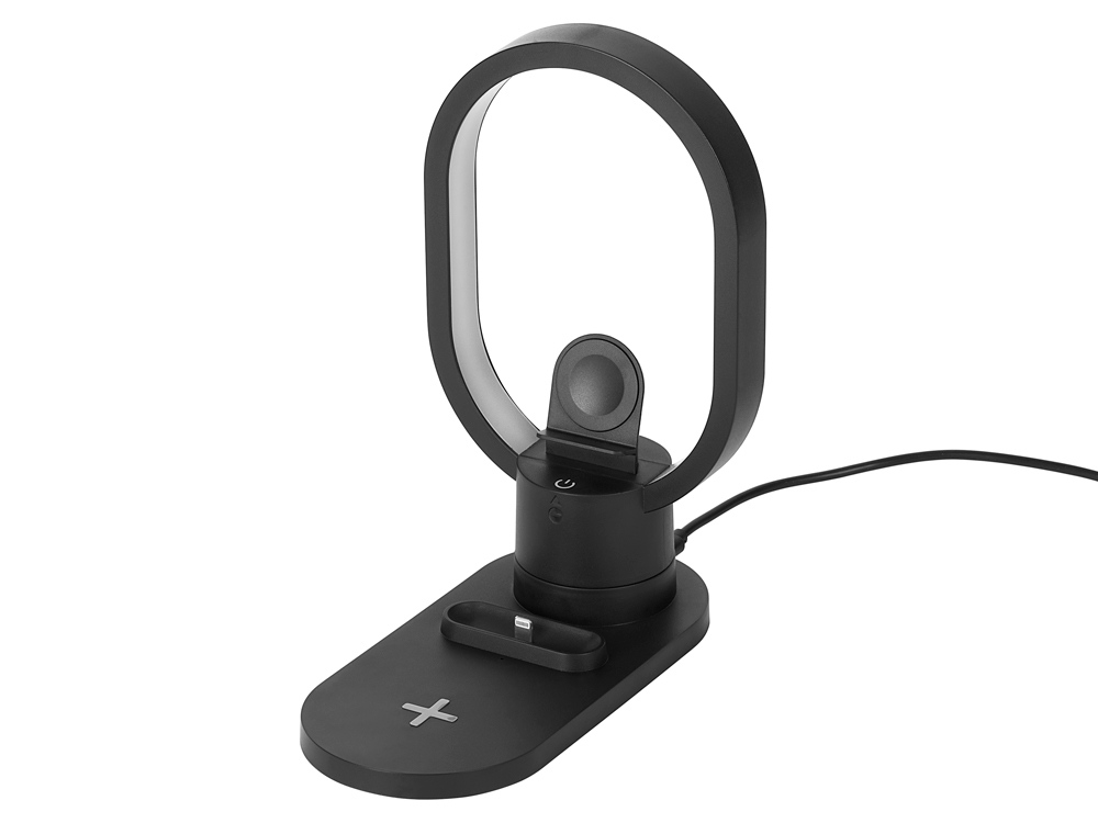 Настольная зарядная станция с лампой для трёх устройств - смартфона с поддержкой беспроводной зарядки, часов Apple и наушников Apple (разъем Lightning). Регулируемый уровень яркости (диммер). Лампу можно вращать вокруг своей оси. Для удобства транспортировки лампу можно отсоединить.