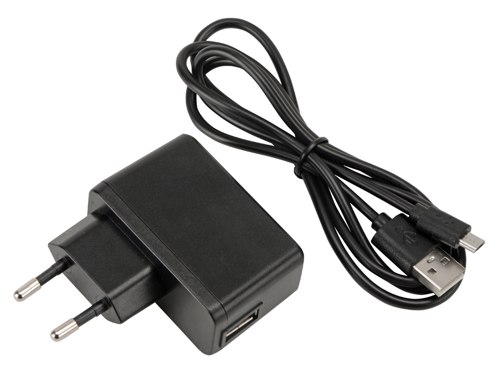 В комплекте адаптер питания 220 В, зарядный кабель и инструкция.