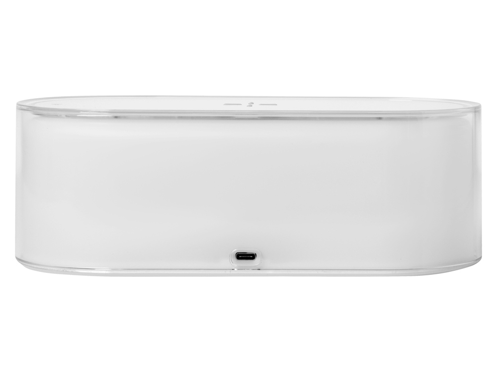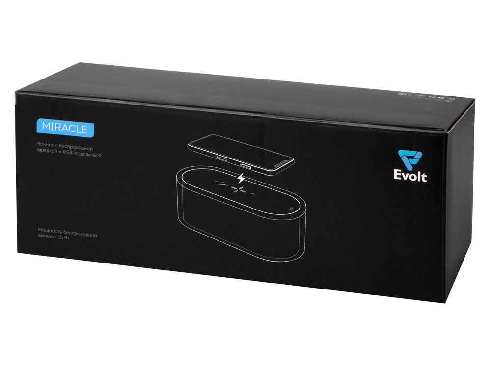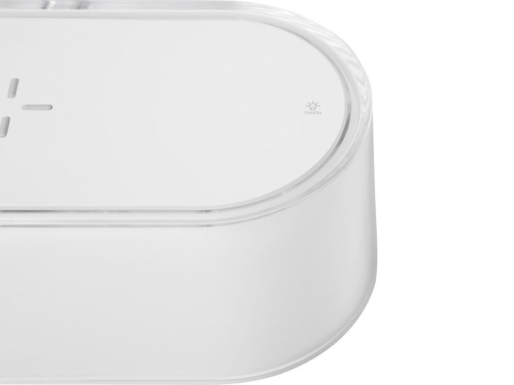 Ночник с RGB-подсветкой из 7 переливающихся цветов. Также есть режимы стандартного и яркого освещения теплым светом. Ночник выполняет функцию зарядной станции для устройств, поддерживающих беспроводную зарядку стандарта Qi мощностью 15 Вт*. Функция ночника работает без подключения к сети благодаря встроенному аккумулятору на 400 мАч. Функция беспроводной зарядки работает только при питании от сети. Устройство можно брендировать методом УФ-печати, тампопечати, а также цифровой печати.
