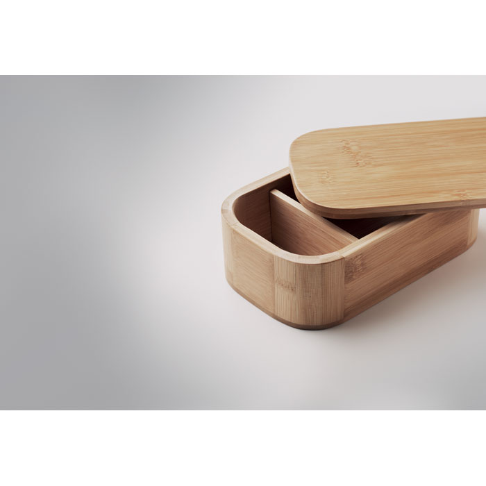 Бамбуковый ланчбокс со съемным разделителем и съемным эластичным ремешком. Только для сухих продуктов. Вместимость: 650 мл. -