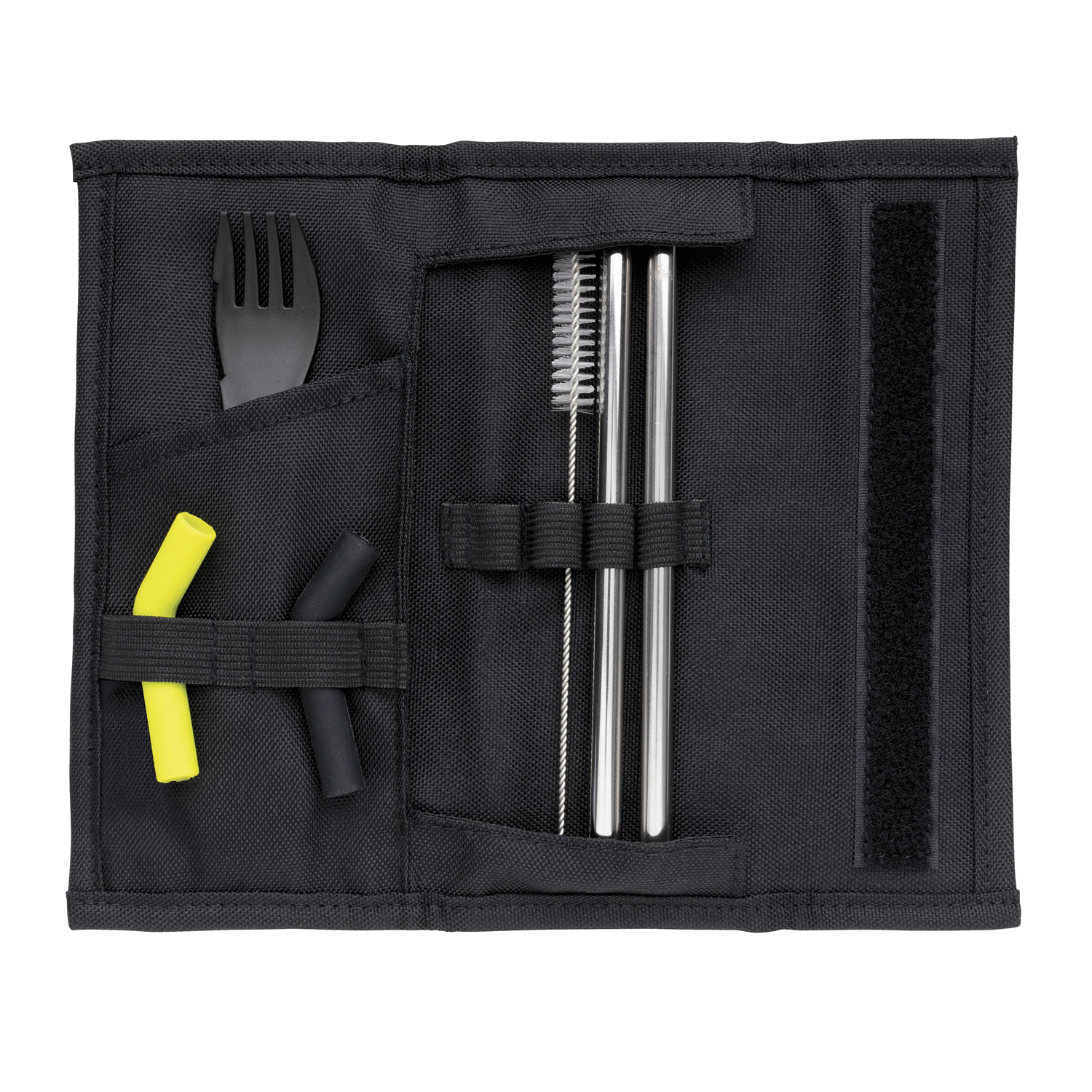 Набор столовых приборов Tierra — идеальный спутник для тех, кто хочет сократить использование одноразового пластика. В него входят 2 соломинки из нержавеющей стали, ершик для мытья, ложка-вилка и 2 силиконовые насадки на трубочки для более комфортного питья. Благодаря разным цветам насадок вы легко отличите их друг от друга. Приборы поставляются в удобном чехле для хранения, который надежно закрывается на липучку. Совместим с посудомоечной машиной. Чехол снаружи — полиэстер 600D, внутри — 100% полиэстер 210D. Не содержит ПВХ.