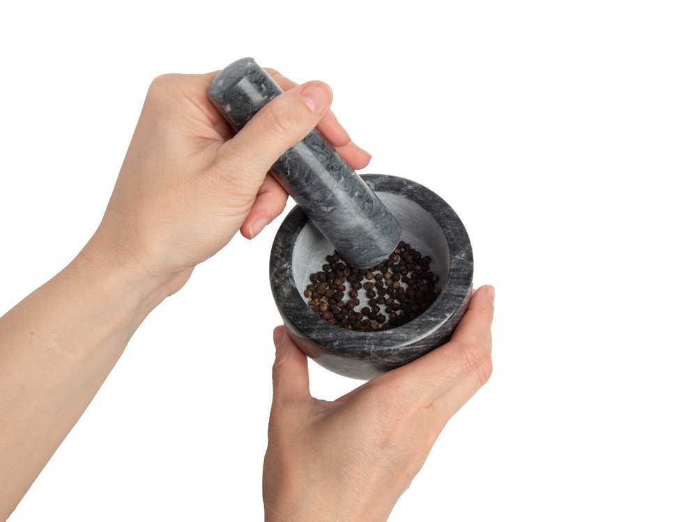 Поставляется в комплекте с пестиком, удобным для обхвата ладонью. Пользоваться ступкой приятно даже просто с точки зрения тактильности, превращая процесс приготовления блюда в почти медитативную практику.