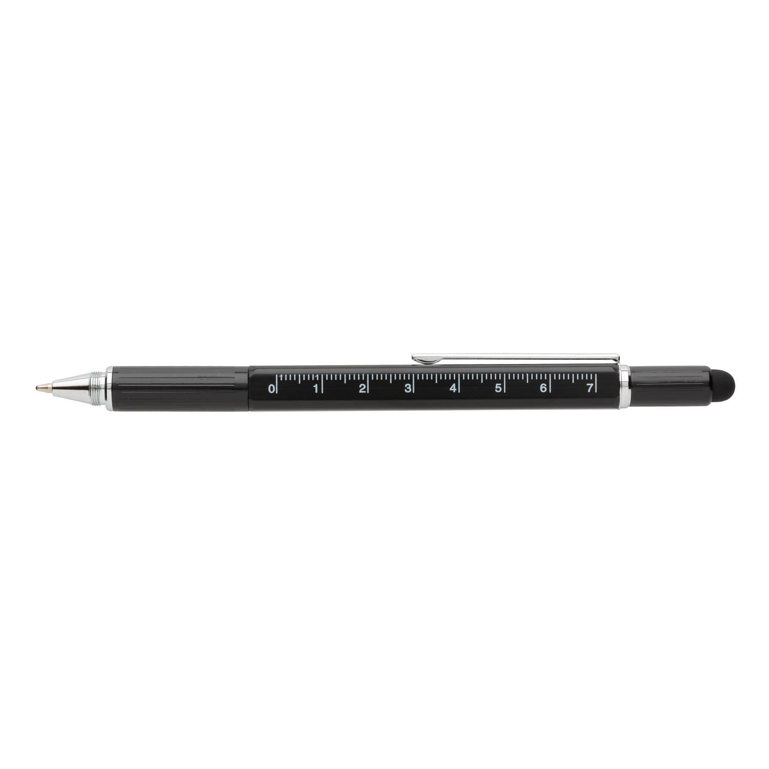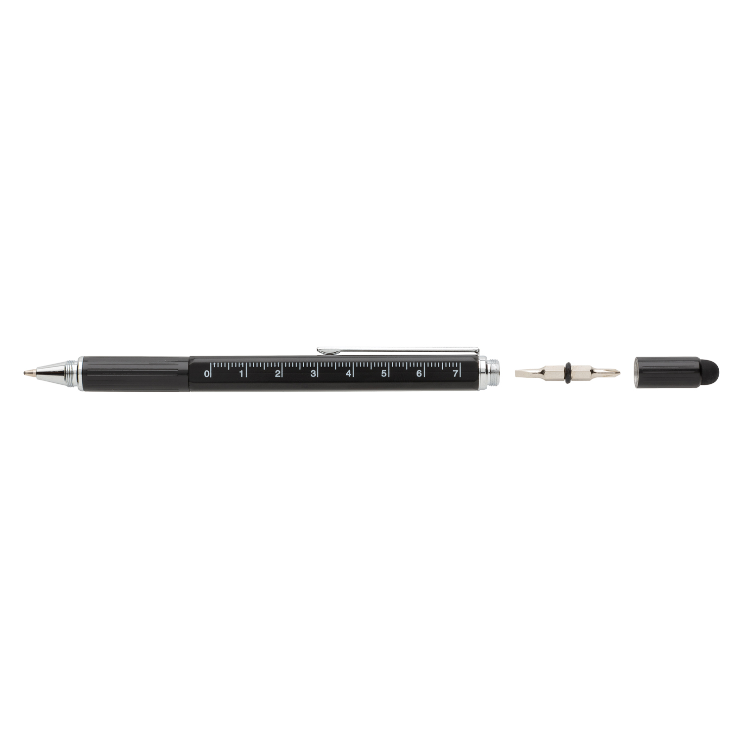 Многофункциональная ручка совмещает в себе линейку длиной 7 см, спиртовой уровень, отвертку, стилус и синюю шариковую ручку, чернил в стержне которой хватит на линию длиной до 400 м. Корпус ручки изготовлен из высококачественной латуни и дополнен удобным алюминиевым клипом.