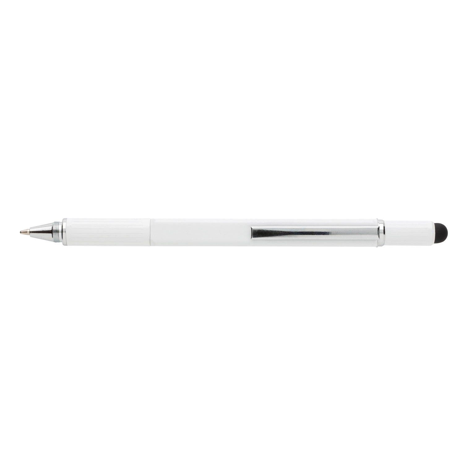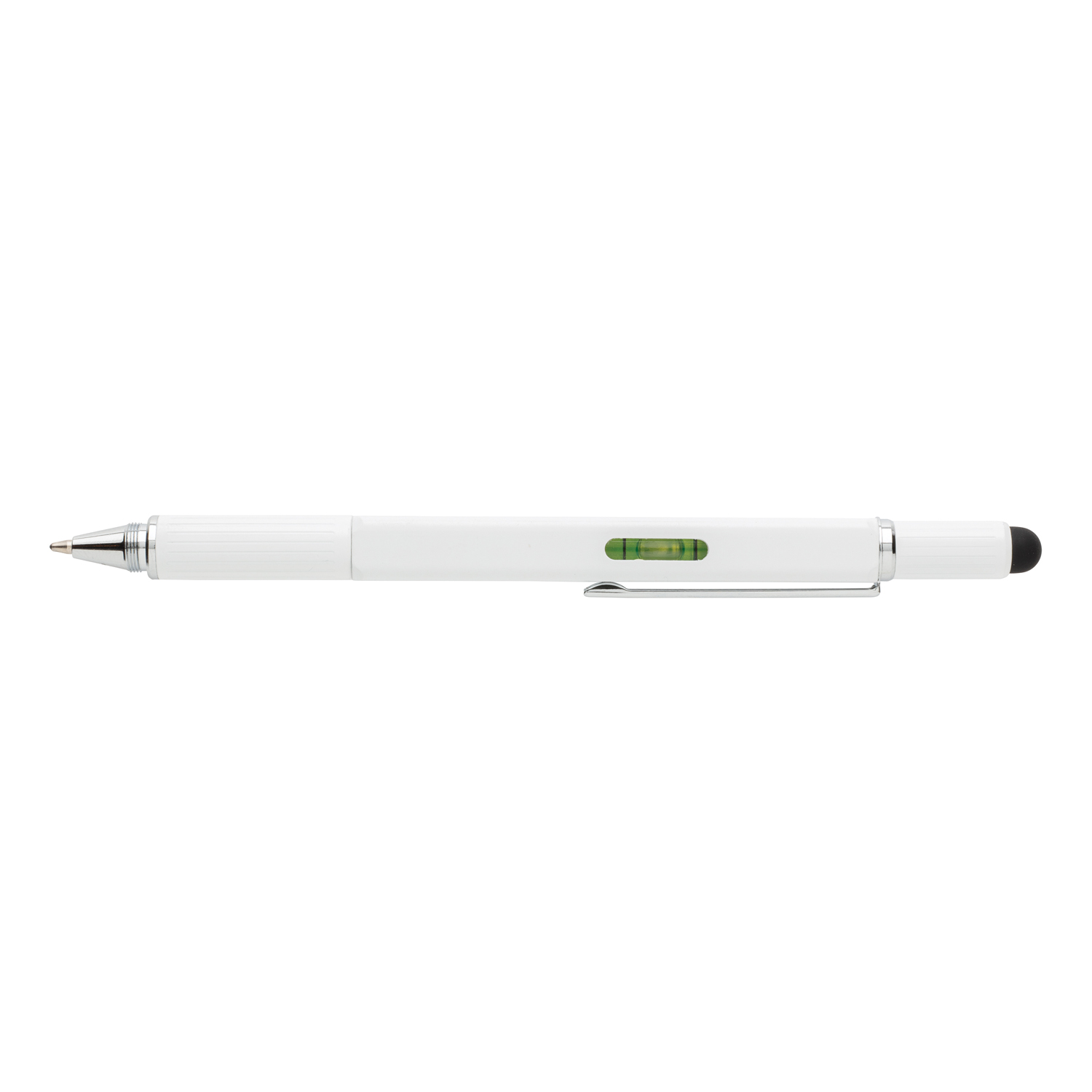 Многофункциональная ручка совмещает в себе линейку длиной 7 см, спиртовой уровень, отвертку, стилус и синюю шариковую ручку, чернил в стержне которой хватит на линию длиной до 400 м. Корпус ручки изготовлен из высококачественной латуни и дополнен удобным алюминиевым клипом.
