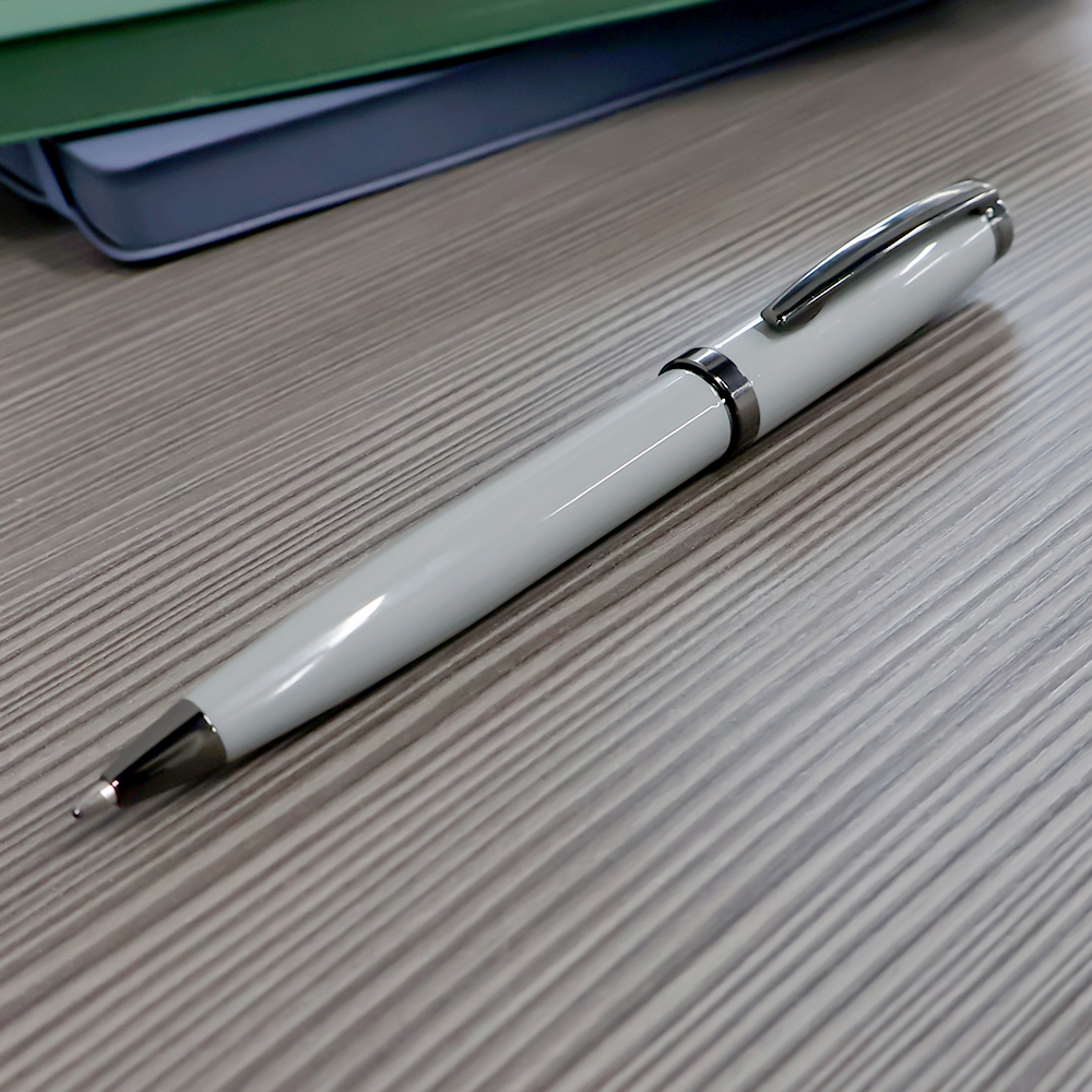 Наша Бетти — подарок для любителей более увесистых и солидных форм. Общий вес ручки — 33 грамма! У нашей красотки поворотный механизм, покрытый глянцем корпус из нержавеющей стали, стержень Паркер 0,7 мм с синими чернилами. Элементы ручки: клип, кольцо и дюбка покрыты ган-метал краской. Ручку приятно держать в руке и демонстрировать публике.- Виды нанесений: Гравировка CO2-А1, УФ-печать