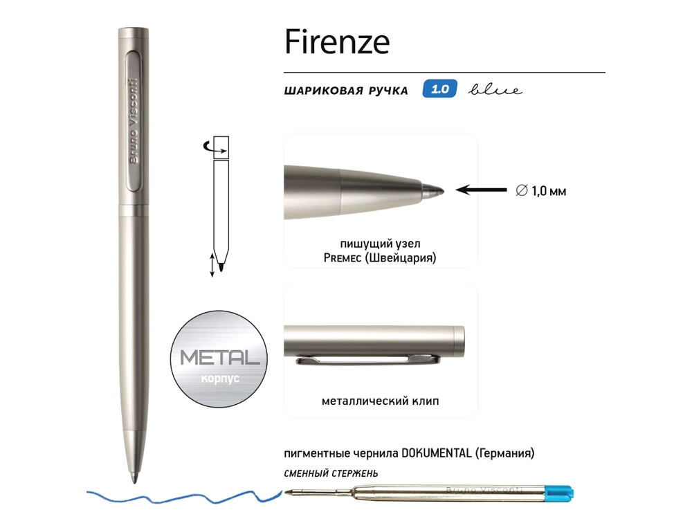 Ручка автоматическая, с легким поворотным механизмом подачи стержня. Надежный пишущий узел d 1,0 мм (от швейцарского производителя Premec) гарантирует высокое качество так же, как и пигментные чернила Dokumental (Германия). Благодаря им писать ручкой Firenze одно удовольствие – она мягко скользит по поверхности бумаги, оставляя ровную, четкую линию. -