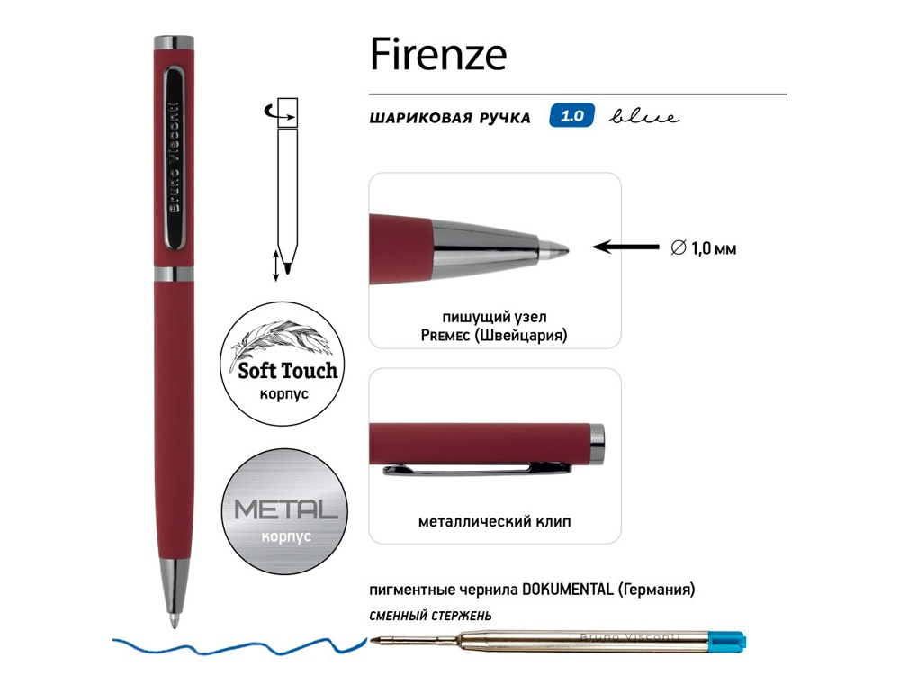 Ручка автоматическая, с легким поворотным механизмом подачи стержня. Надежный пишущий узел d 1,0 мм (от швейцарского производителя Premec) гарантирует высокое качество также, как и пигментные чернила Dokumental (Германия). Благодаря им писать ручкой Firenze одно удовольствие – она мягко скользит по поверхности бумаги, оставляя ровную, четкую линию.