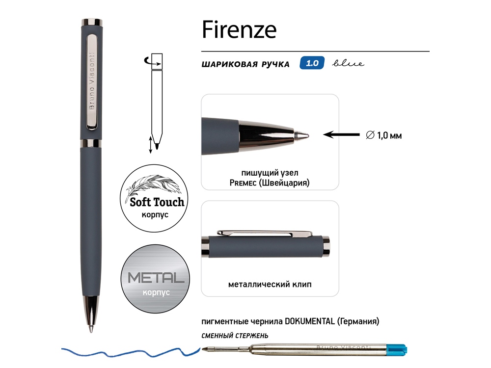 Ручка автоматическая, с легким поворотным механизмом подачи стержня. Надежный пишущий узел d 1,0 мм (от швейцарского производителя Premec) гарантирует высокое качество также, как и пигментные чернила Dokumental (Германия). Благодаря им писать ручкой Firenze одно удовольствие – она мягко скользит по поверхности бумаги, оставляя ровную, четкую линию. -