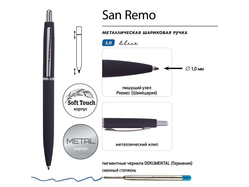 Как и все подарочные ручки Bruno Visconti, San Remo - обладательница стержня с пишущим узлом от швейцарского производителя Premec и перманентными чернилами немецкого производителя Dokumental. Поэтому можно быть абсолютно уверенным в качестве письма.