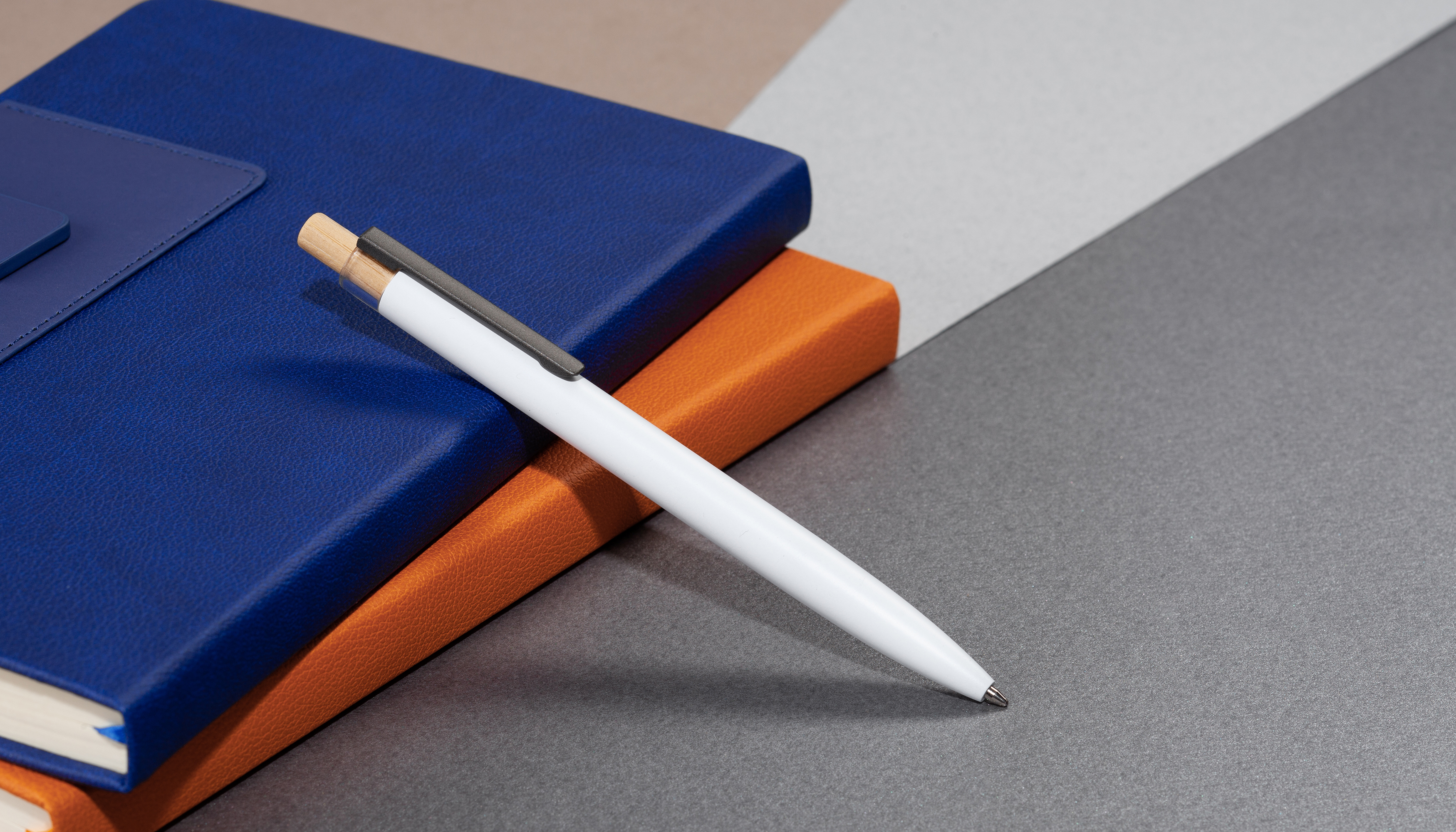 Трендовая эко-ручка, изготовленная из переработанных алюминия и пластика, с кнопкой из бамбука.
