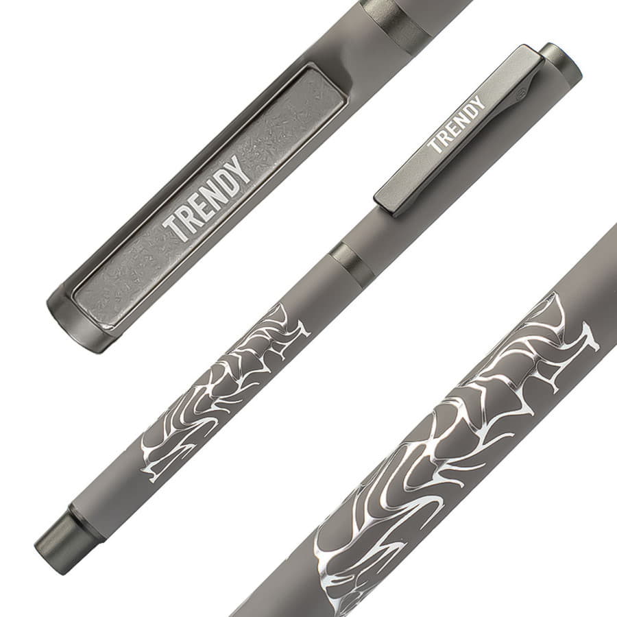Название данной ручки даже не нужно переводить с английского языка, ведь оно говорит само за себя. Необычная ручка с колпачком точно обратит на себя внимание на рынке рекламной индустрии, а колпачок послужит дополнительным элементом для нанесения. Сама же ручка является превосходным инструментом для письма. Стальной пищущий узел с шариком из карбида вольфрама, шелковая формула немецких чернил от Dokumental, удобный упор для пальцев обеспечат мягкое и комфортное письмо. Если вы готовы и открыты всему экспериментальному и новому, то модель TRENDY –правильный выбор. • Pantone, близкий к Cool Grey 8 C• Размер 135*10 мм• Корпус и колпачок из алюминия с покрытием soft touch• Металлический клип-прищепка серого цвета • Пластиковые носик и заглушка в цвет клипа• Пулевидный пишущий узел 1.0 мм• Длина линии письма 1000 м • Чернила Dokumental. Цвет чернил синий• Сменный стержень Parker type• Подложка вскрывается зеркалом -