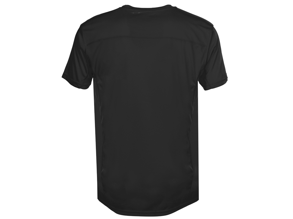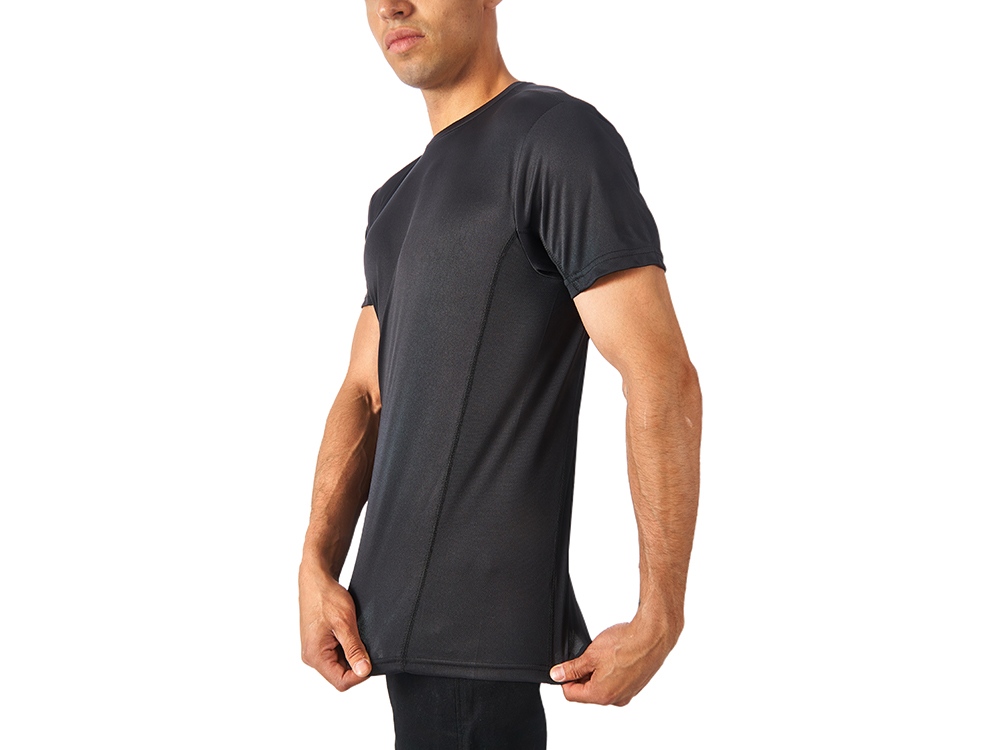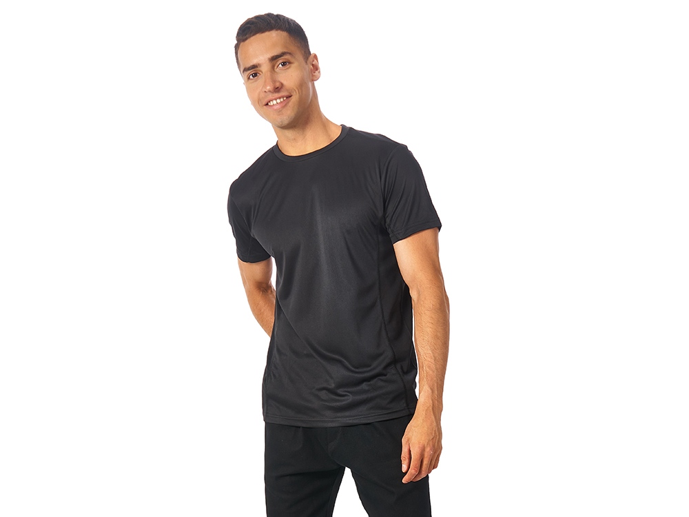 Мужская спортивная футболка выполнена из двух разных видов полотна: спинка и перед из интерлока имеют гладкую поверхность, а декоративные вставки выполнены из спортивной сетки ячеистой структуры. Благодаря наличию таких вставок воздух свободно проникает под футболку, охлаждая кожу во время спортивных нагрузок.