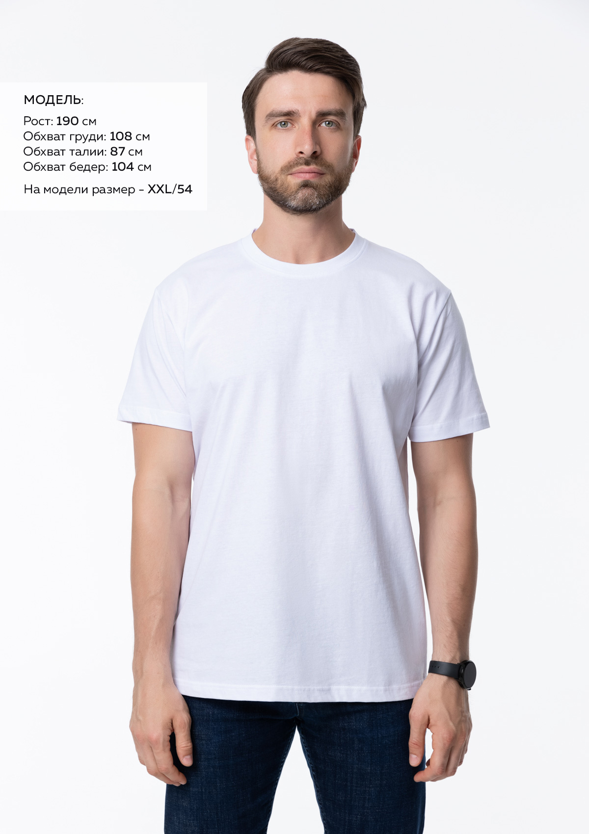 * Размер мужской футболки: XXL/54. Параметры модели: рост 190 см.; обхват груди 108 см.; обхват талии 87 см.; обхват бедер 104 см. -