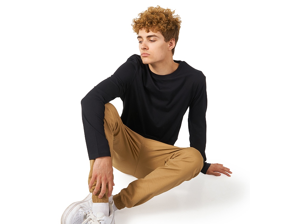 Футболка с длинным рукавом комфортной посадки с боковыми швами. Горловина обработана рибом 1х1 и тесьмой по спинке. Футболка выполнена из хлопкового джерси. -