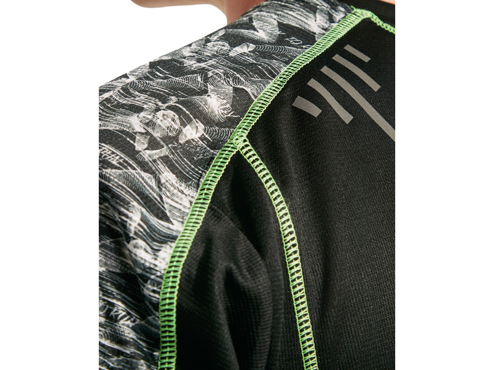 Спортивная футболка с коротким рукавом и принтованными вставками. Контрастные отстрочки плоским швом, светоотражающие элементы на полочке и спинке. Эко лейбл на рукаве.