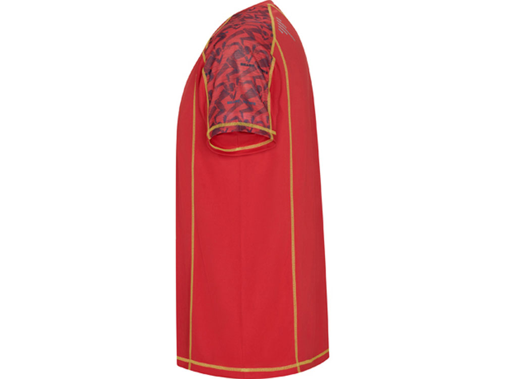 Спортивная футболка с коротким рукавом и принтованными вставками. Контрастные отстрочки плоским швом, светоотражающие элементы на полочке и спинке. Эко лейбл на рукаве.