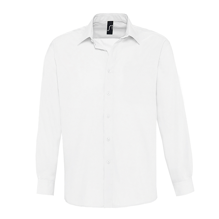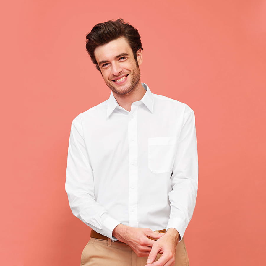 Мужская рубашка из смесового поплина с длинным рукавом. Смесовый поплин обеспечивает максимальный комфорт, лёгок в уход, не мнется. Стандартный крой (прямой). Длинный рукав. Жесткий воротник. Планка с 7 пуговицами в цвет изделия. Нагрудный карман слева. Цвет близкий к PANTONE 7454C -