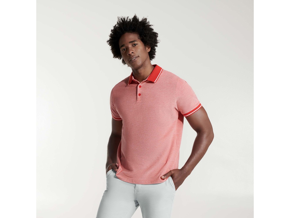 Рубашка поло с коротким рукавом. Манжеты и воротник из однотонного риба 1х1 с контрастными полосками. Планка на 3 пуговицы. Низ с боковыми разрезами, отделанными тесьмой. Спинка немного длиннее полочки. Полотно с меланжевым эффектом. -