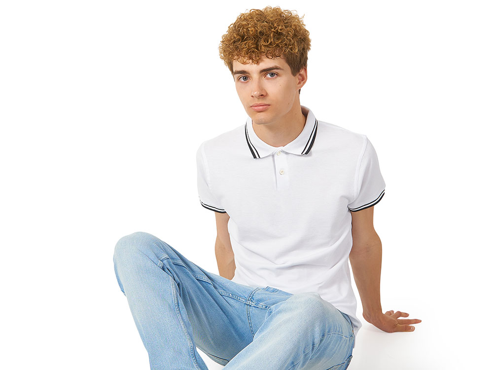 Рубашка-поло Erie с окантовкой. Воротник и манжеты резинка 1х1. Мужская модель с двумя пуговицами, женская - 4 пуговицы в тон изделия. Обшивка внутри воротника. Женская модель с разрезами по бокам. Женская модель приталена. Пике, 100% чесаный хлопок. Плотность 180 г/м2. -
