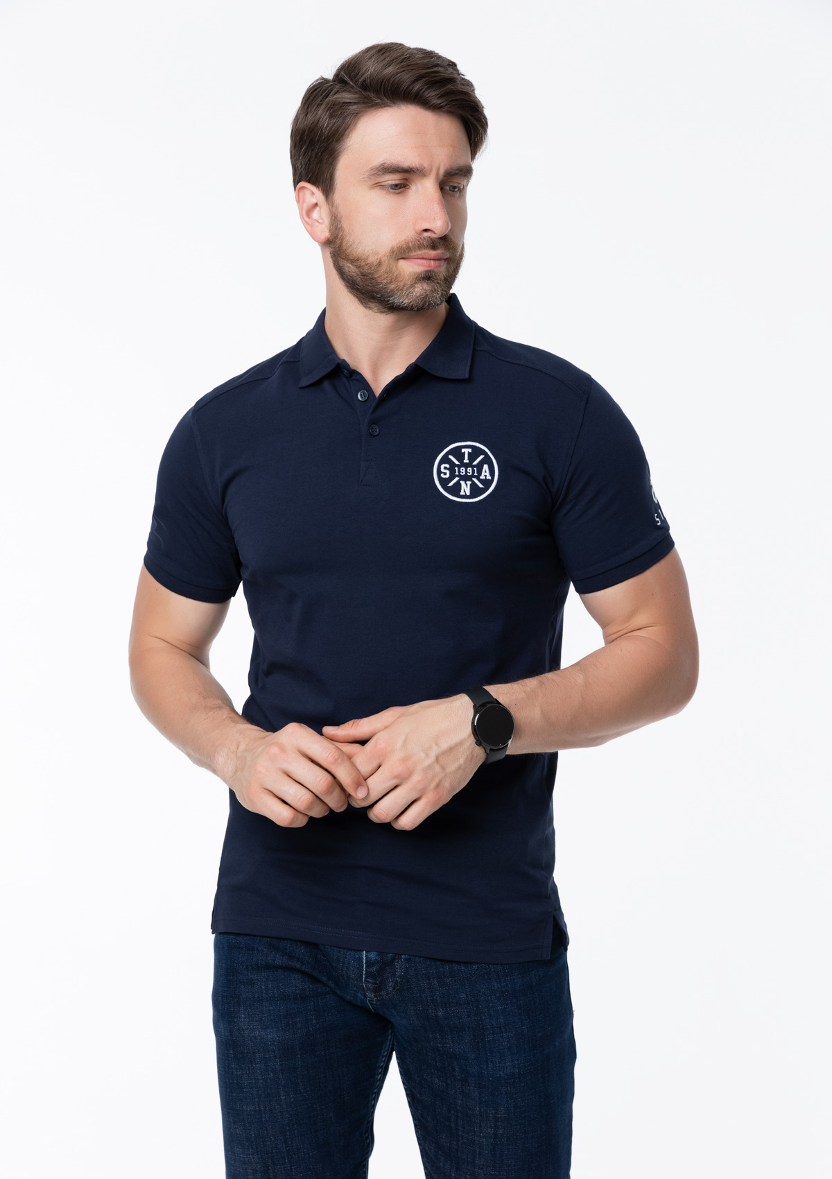 Размер мужской рубашки поло: XL/52. Параметры модели: рост 190 см.; обхват груди 108 см.; обхват талии 87 см.; обхват бедер 104 см.