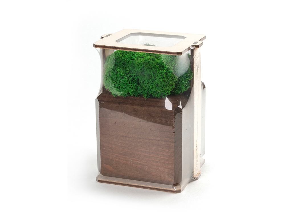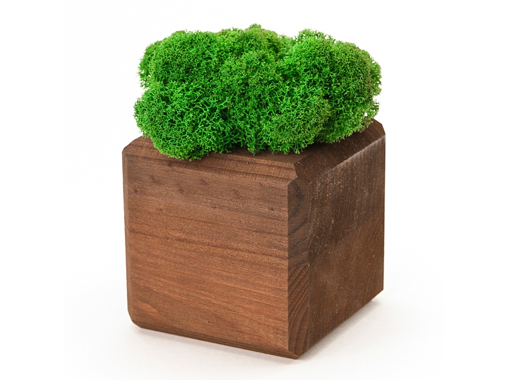 Изделие состоит из стабилизированного мха ягеля, деревянного куба и деревянного упаковочного каркаса. Отталкивает пыль и придает интерьеру индивидуальность. Размер изделия 8х8х13 см.