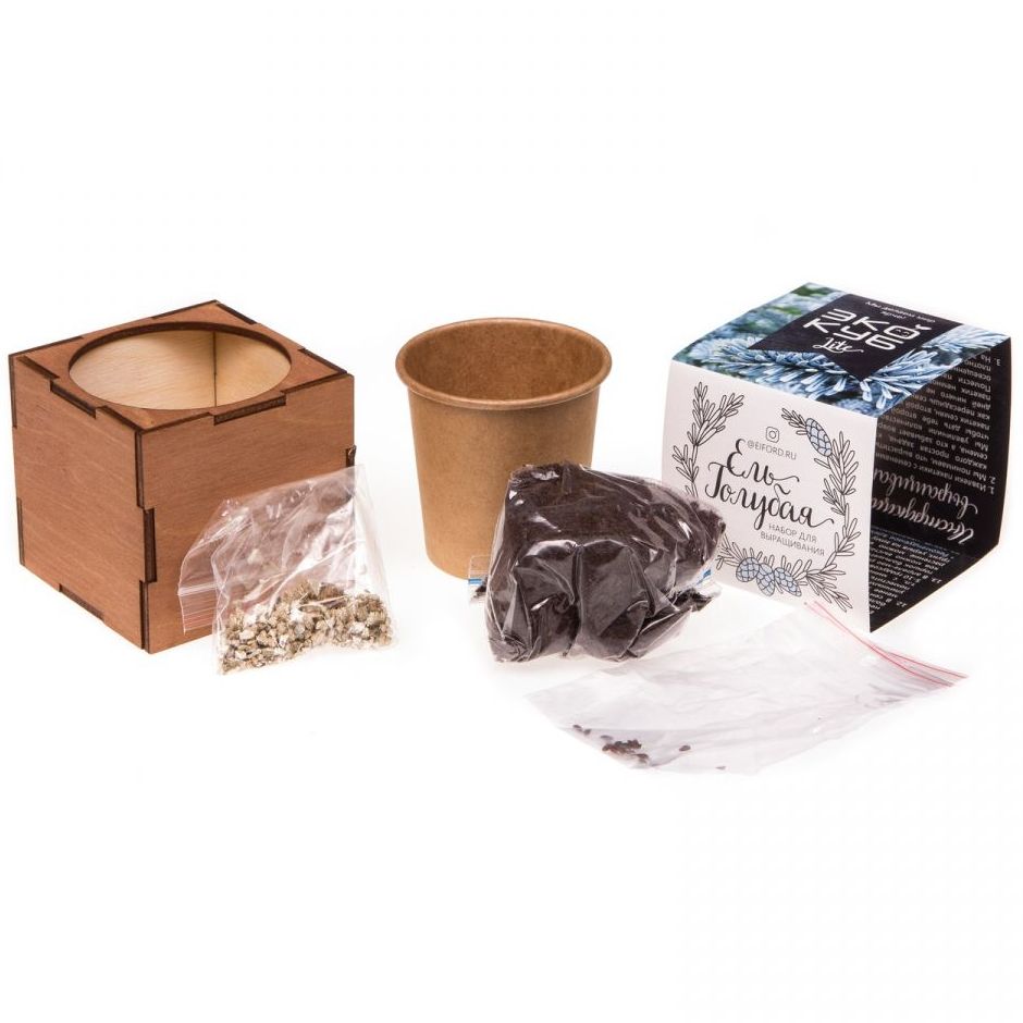 В наборе: деревянный куб, бумажный стаканчик, питательный грунт, семена, вермикулит.